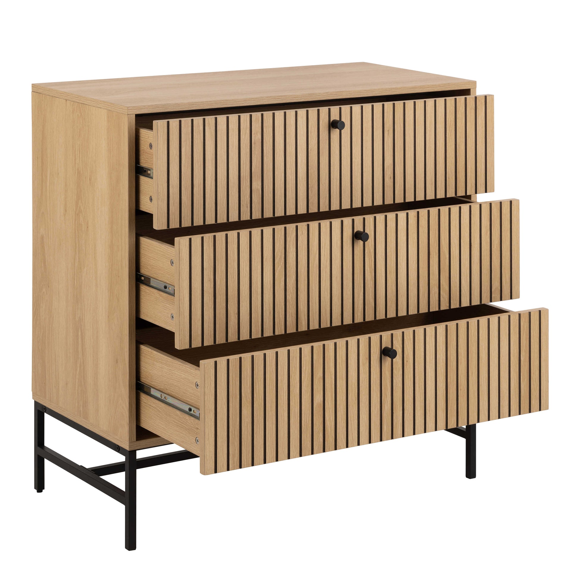 Ground the bedroom with a chest of drawers that channels Scandinavian calm and confident structure. An oak look surface with textured lamella detailing brings warmth and depth, while clean lines keep the design feeling modern and composed. The overall silhouette feels intentional and balanced, making it easy to style in both relaxed and refined interiors.