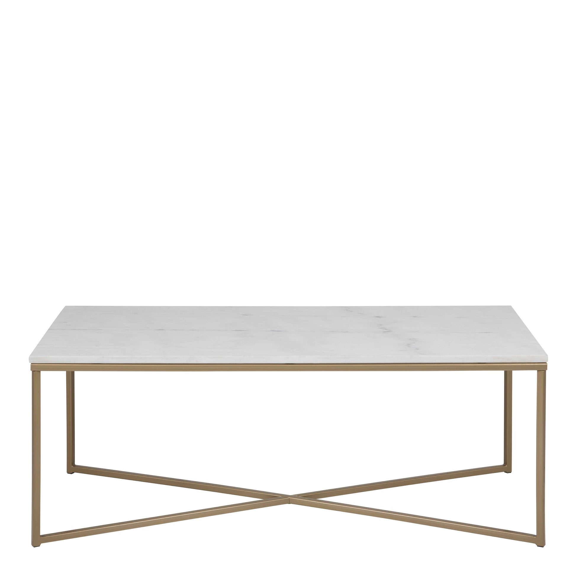 Anchor the room with a coffee table that feels confident and quietly luxurious. A white marble surface brings natural veining and depth, set against a sculptural crossed metal base in warm brass tone. The contrast feels modern yet timeless, creating a focal point that elevates relaxed seating areas without overpowering the space.