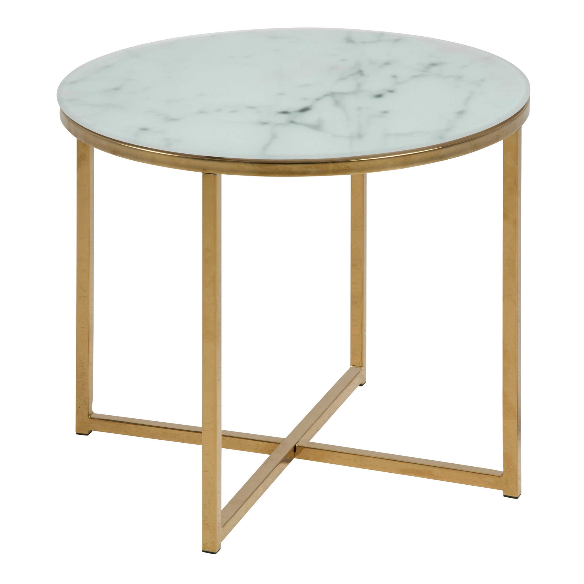 Bring a refined accent into the space with a round side table that balances softness and structure. A white marble effect glass surface adds light and elegance, while the crossed metal base in a warm gold tone introduces sculptural interest. The contrast feels modern yet timeless, making it an easy addition to curated interiors.