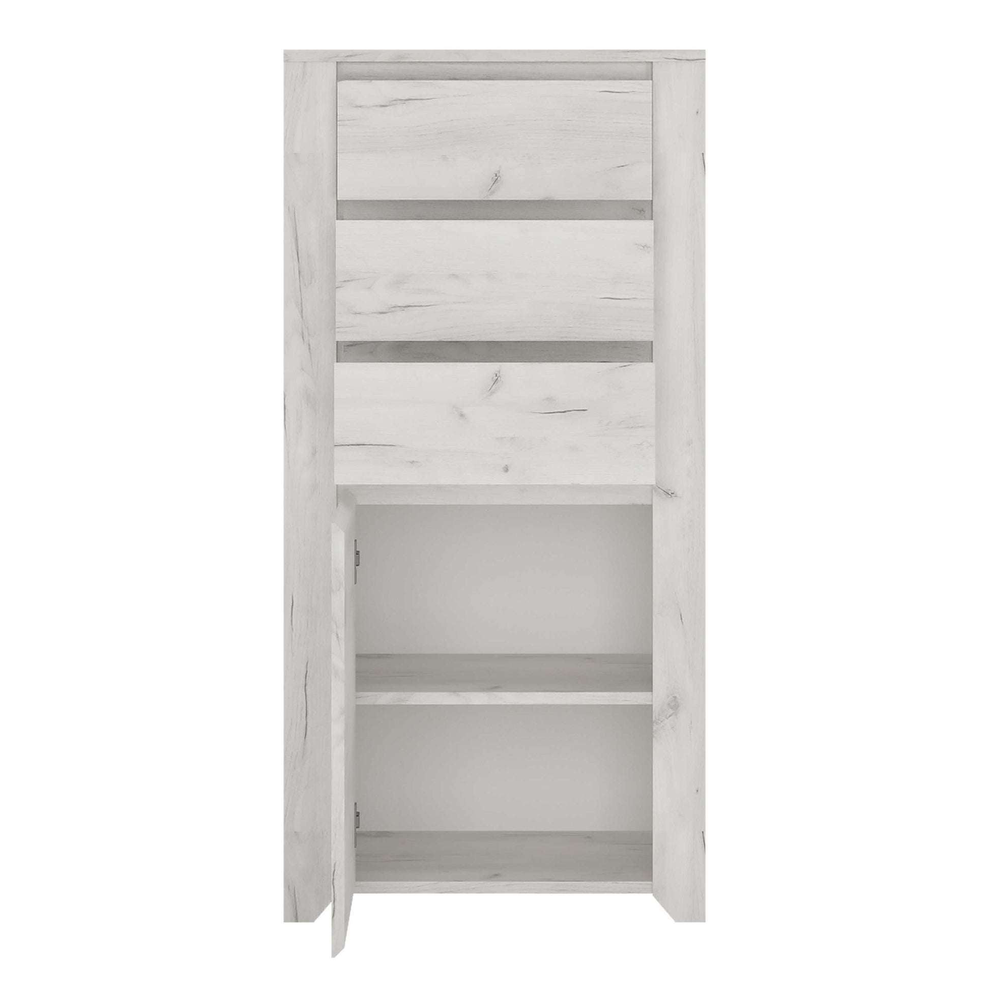 Storage is neatly balanced with a cupboard and three drawers, giving you flexible space for clothes, accessories and everyday essentials. Everything stays easy to reach while the exterior remains uncluttered. Practical and quietly confident, this storage chest offers everyday function with an effortless modern attitude.
