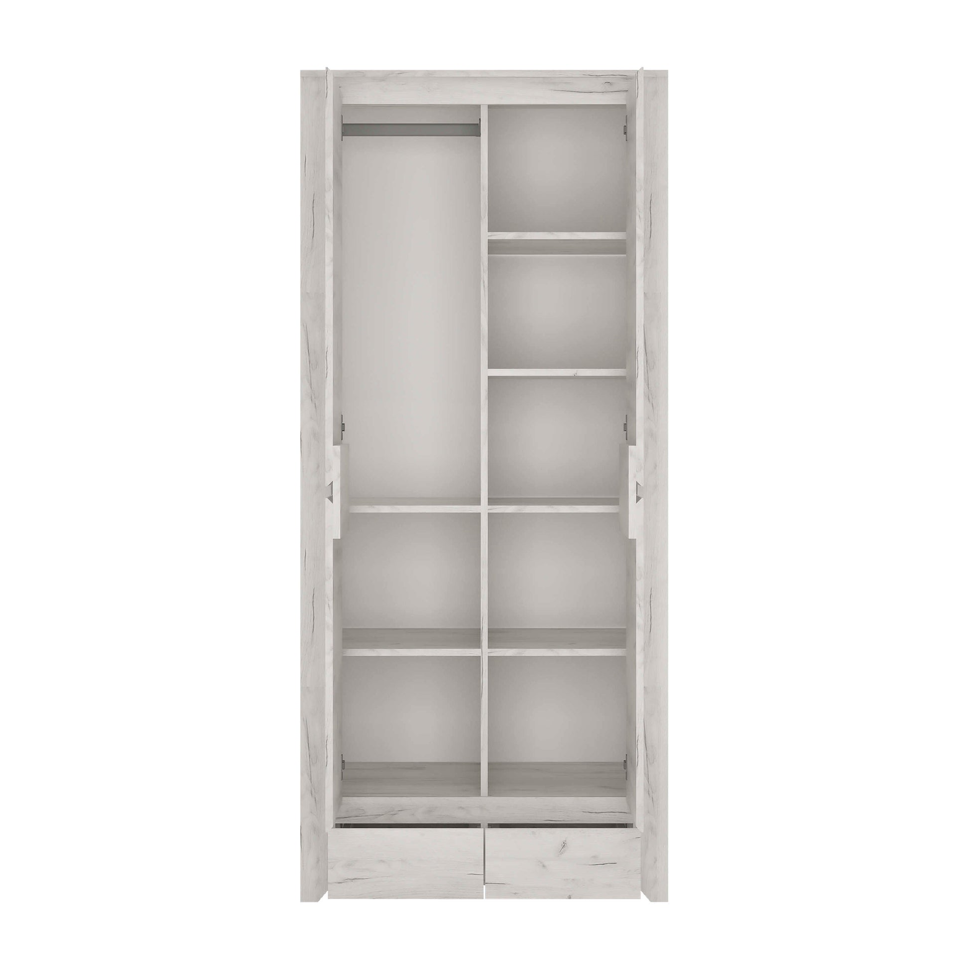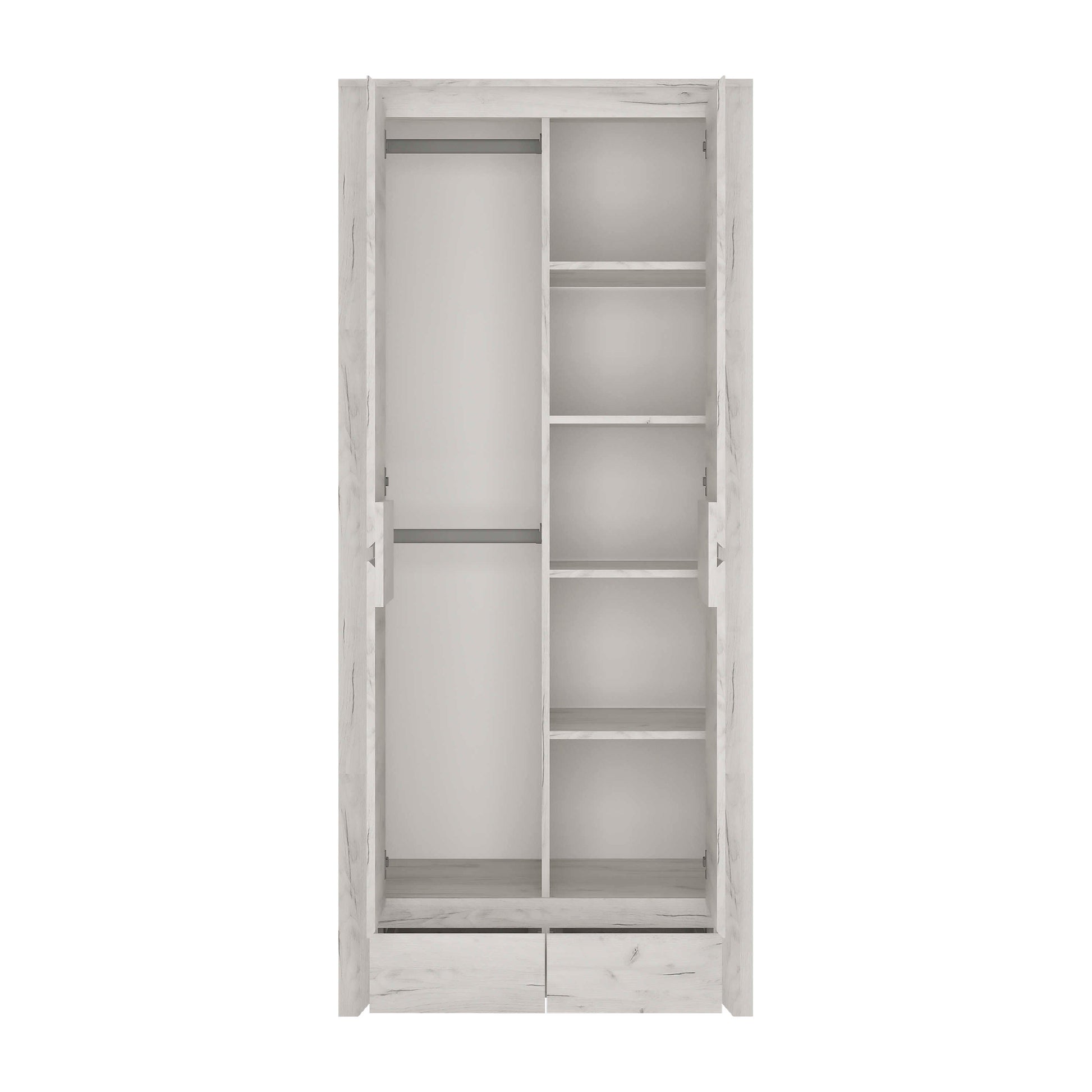 Inside, the layout is flexible, letting you organise storage in a way that suits your routine. Clothes rails and shelves adapt to your needs, while two handle free drawers offer generous space for folded items and essentials. It is a practical, well judged piece that blends function with an effortless modern attitude.