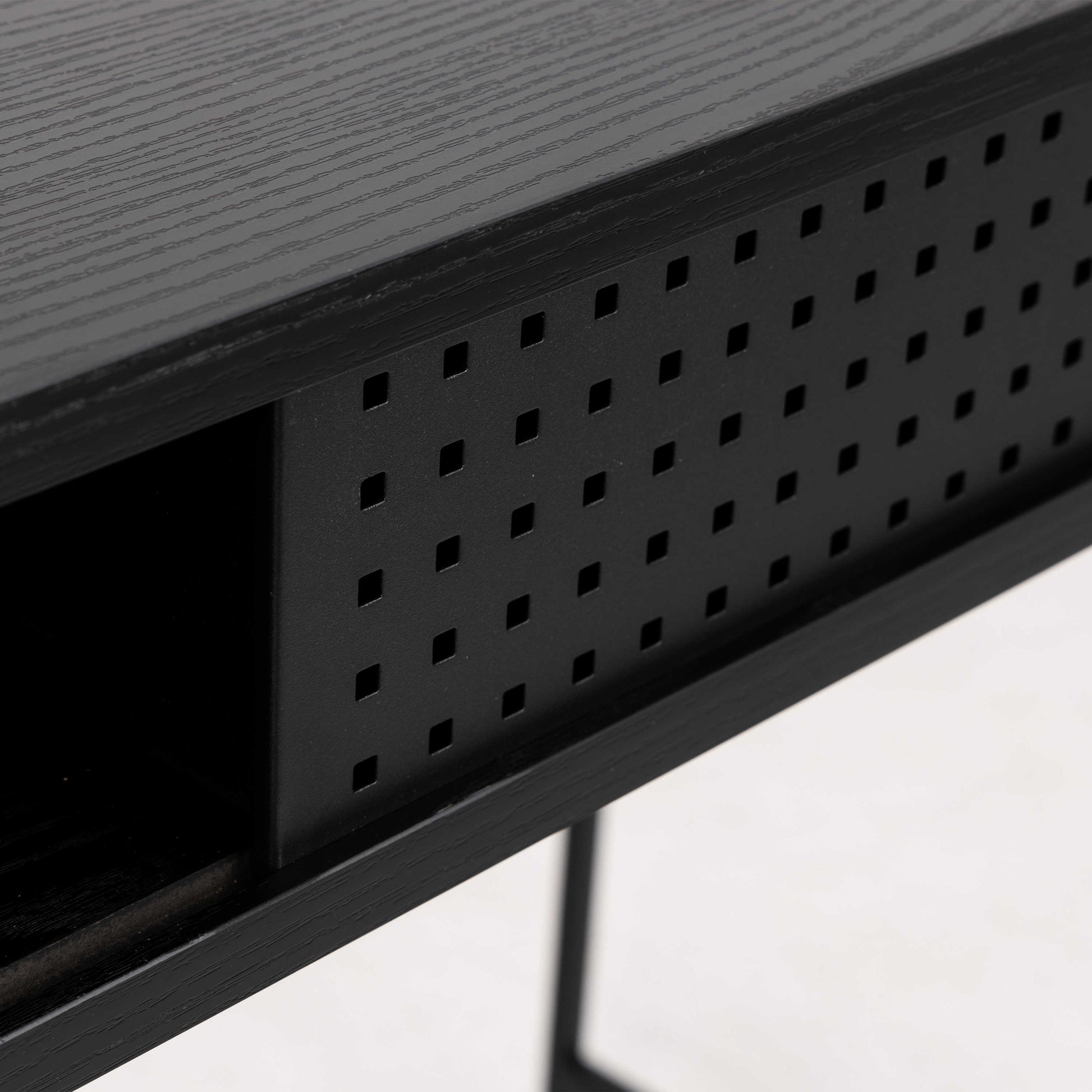 A sliding door shelf offers discreet storage, keeping everyday items tucked away while the surface stays clear. The metal legs give it a grounded feel while maintaining an open look. Easy to clean and practical for daily use, it is a smart workspace piece with a relaxed contemporary attitude.