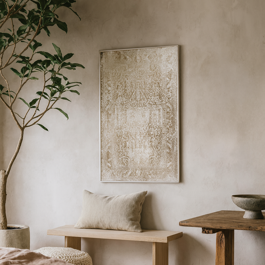 With the allure of a timeworn tapestry, this mirror carries the spirit of antique European interiors. Its surface features an intricate ornamental design with a beautifully distressed patina, blending reflective glass with the faded charm of aged textiles. The effect is striking—part mirror, part artwork, entirely unique.