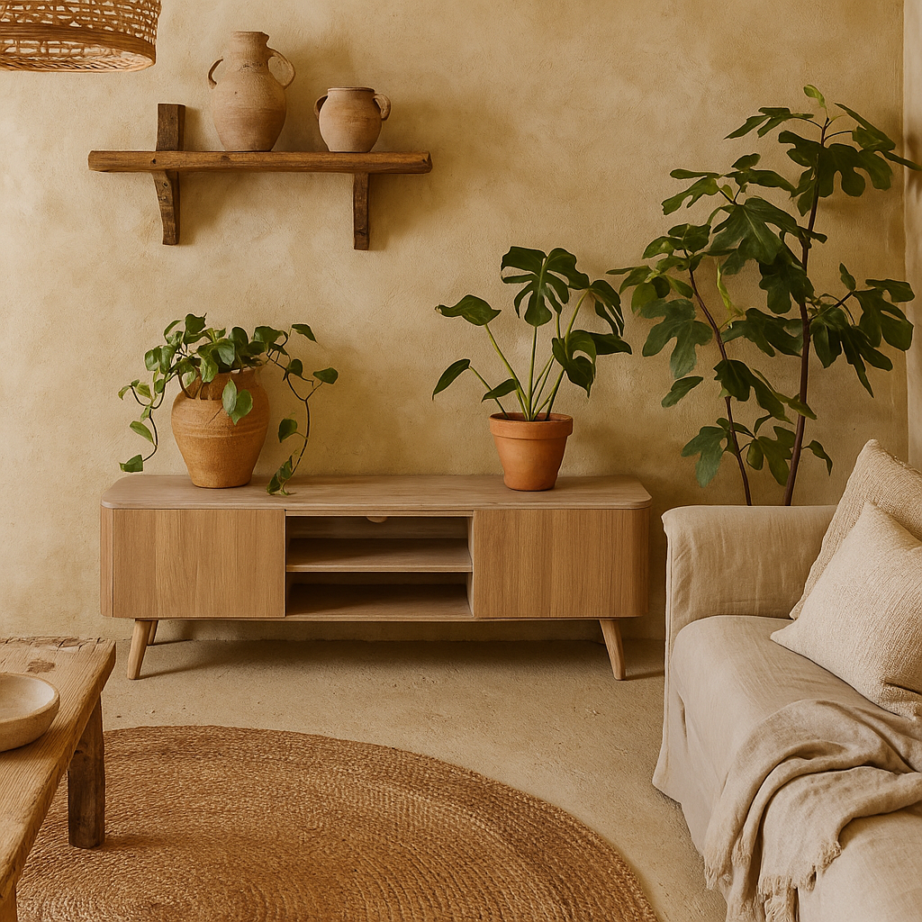Function meets form with two spacious cupboards and open shelving — ideal for storing your media essentials, books, or curated décor. This piece captures the essence of slow living, where craftsmanship, texture, and tone work in harmony. Style it with linen throws, muted ceramics, and abundant greenery to complete the modern-organic mood.
