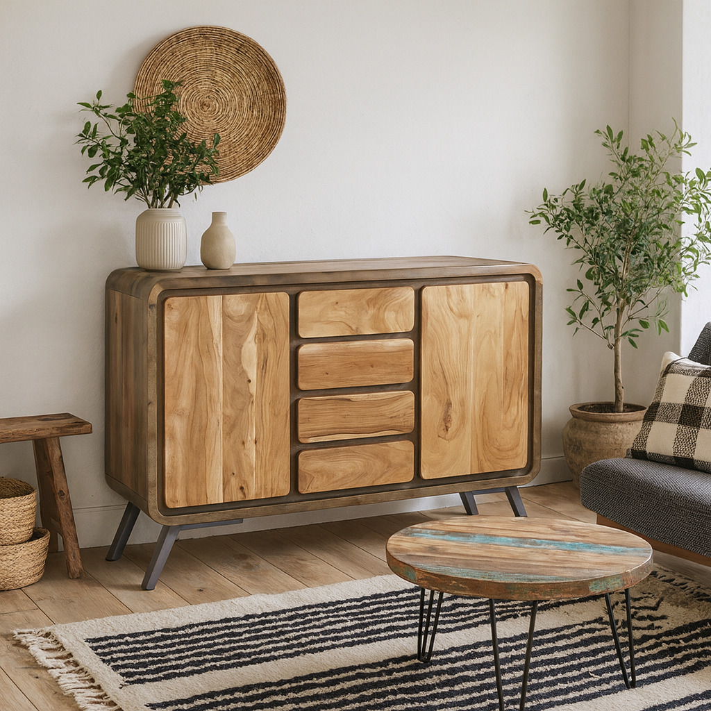 With two spacious cupboards and four smooth front drawers, this sideboard offers generous storage for tableware, linens, tech accessories or everyday essentials. Sturdy angled metal legs provide excellent support and a striking contrast to the warm wood tones. Practical, stylish and full of personality, this piece is perfect for modern homes that appreciate natural materials, clean lines and functional elegance.