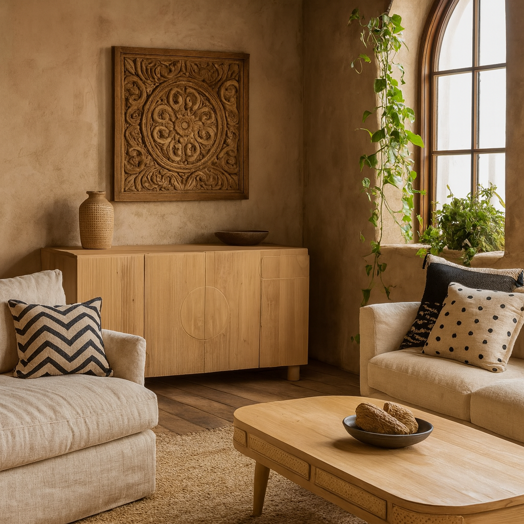 This sideboard offers plenty of storage behind its sculpted doors, making it as practical as it is beautiful. Whether styled in a dining area or living room, it grounds the space with texture and warmth. Pair it with ceramic accents, greenery, and woven materials for a perfectly curated, modern organic finish.