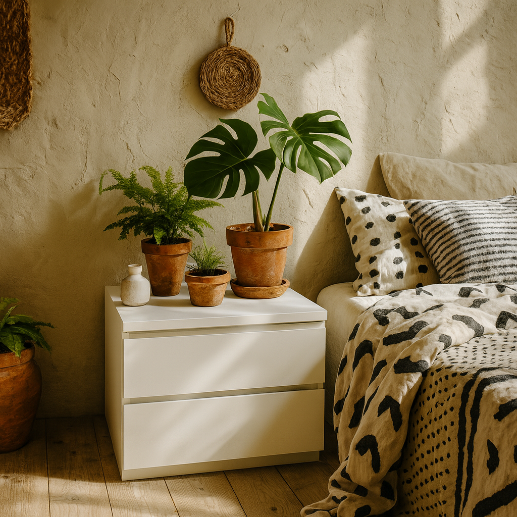 Two drawers glide smoothly, making everyday essentials easy to reach when you need them. The integrated handles keep the look simple and refined, while the flat packed format makes it easy to bring into your home. It is a practical piece that balances function with an effortless modern attitude.