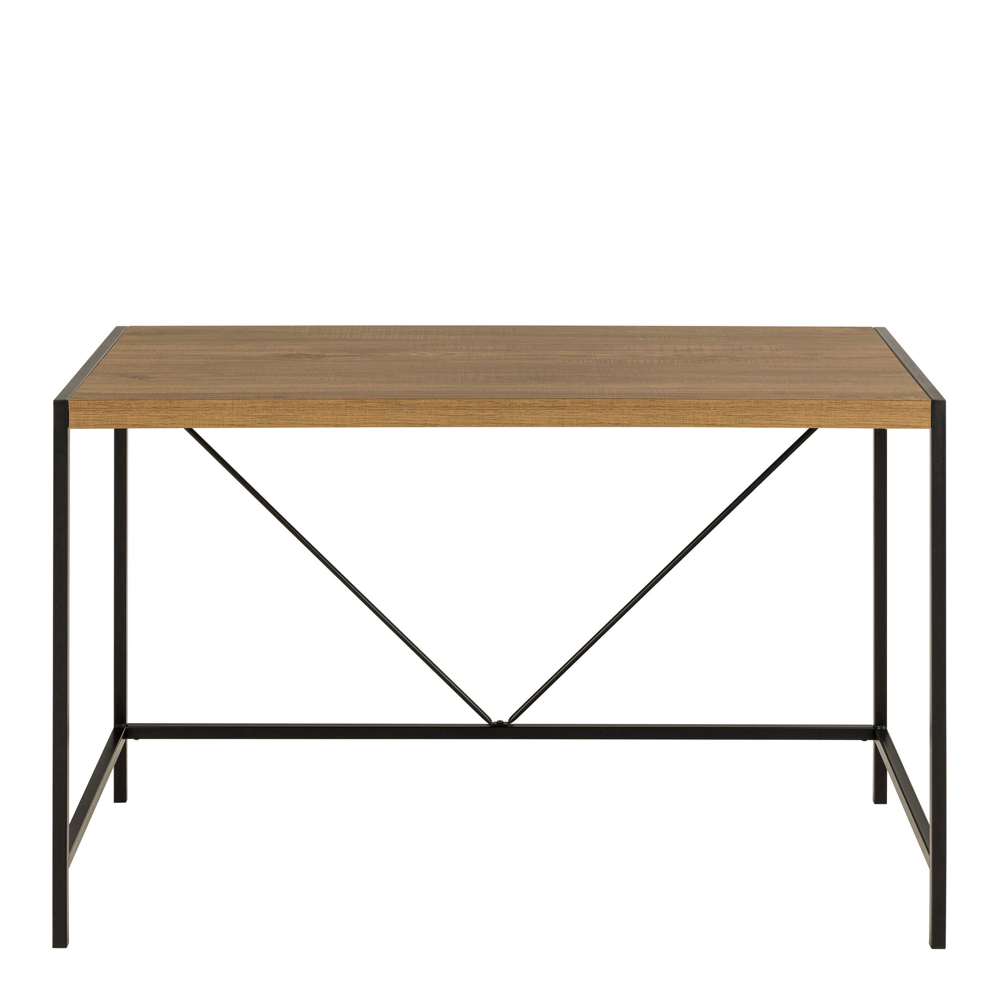 This office desk brings a confident industrial mood to your workspace, pairing a rustic oak effect top with a strong black steel frame. The contrast feels warm yet modern, creating a setup that looks considered without being formal. A subtle V shaped wire detail adds personality, giving the desk a creative edge that lifts the room while keeping things grounded and practical.