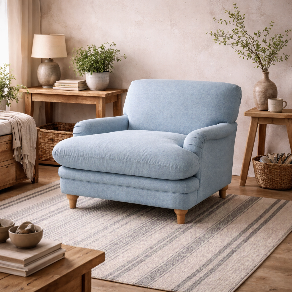 This large occasional chair is upholstered in soft duck egg blue chenille, offering a plush surface with a gentle sheen and visible weave. The generous seat depth and wide proportions allow space to stretch out, while thick cushioning creates a supportive yet relaxed sit. Its rounded lines soften the shape, giving the chair a welcoming, cocooned feel without looking bulky.