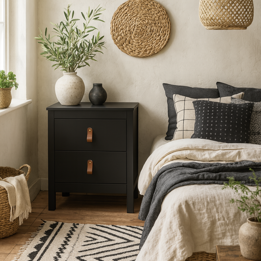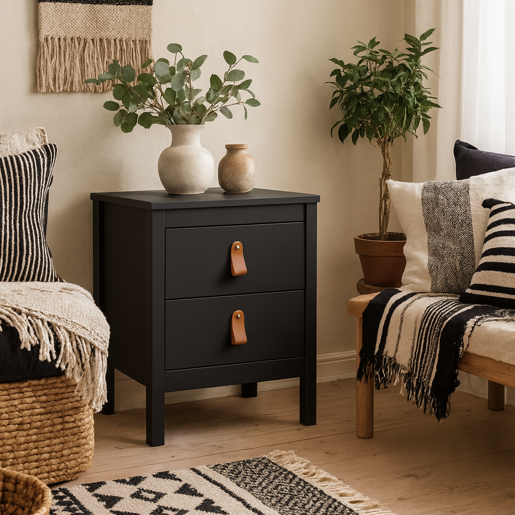 Bring a moody, modern edge to the bedroom with this bedside table finished in deep matt black. The clean shape keeps the look calm and confident, while warm leather strap handles add a soft contrast that feels crafted rather than cold. It sits neatly beside the bed, grounding the space and adding character without demanding attention. The overall feel is relaxed, contemporary and quietly bold.