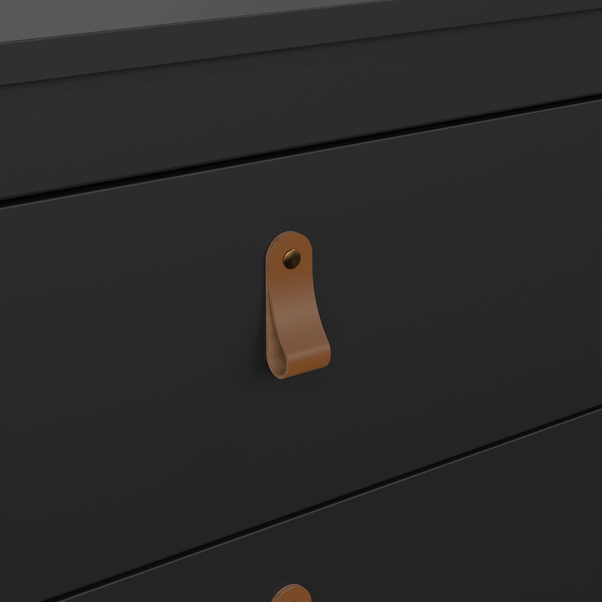 Bring a bold, moody edge to your space with this chest of drawers finished in deep matt black. Clean lines keep the look calm and contemporary, while the rich tone adds depth and confidence without feeling heavy. Brown leather strap handles introduce warmth and texture, creating a striking contrast that feels crafted rather than clinical. It sits comfortably in modern bedrooms, adding character while keeping the overall mood relaxed and intentional.