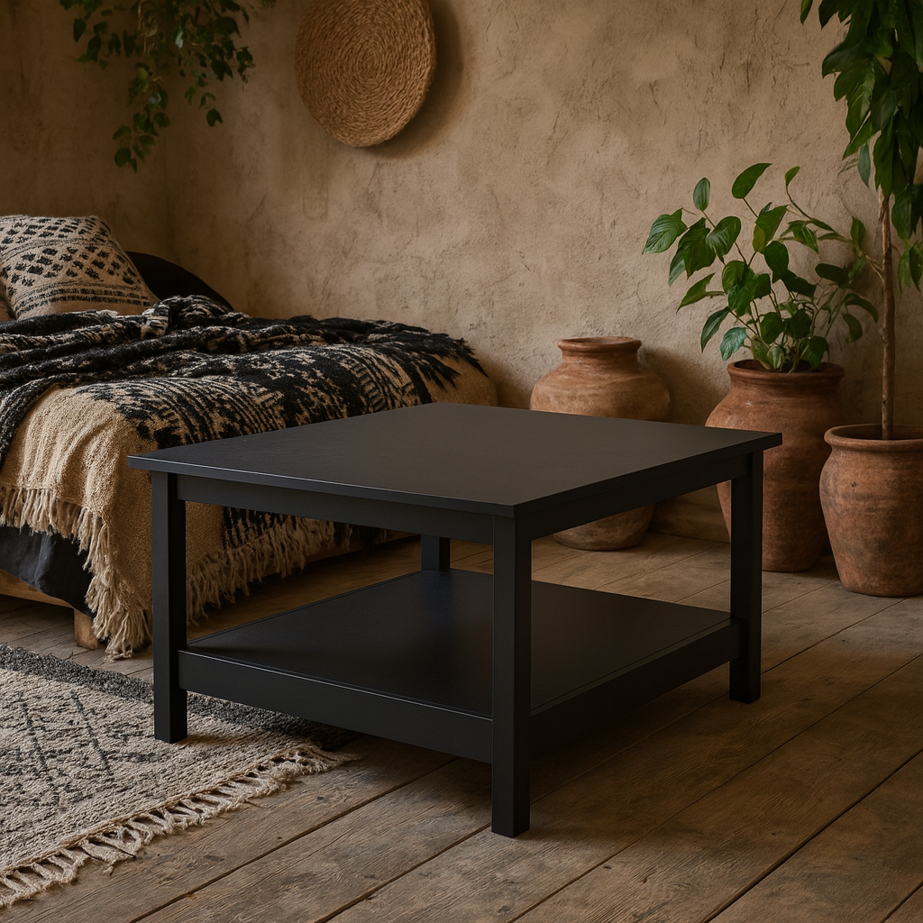 Clean geometry and a deep matt finish give this coffee table a confident modern presence that anchors the room without fuss. A simple square form keeps the look calm and uncluttered, allowing surrounding pieces to breathe. The lower shelf adds an easy layer of practicality, ideal for books or everyday items you want close at hand while keeping the surface clear and composed.