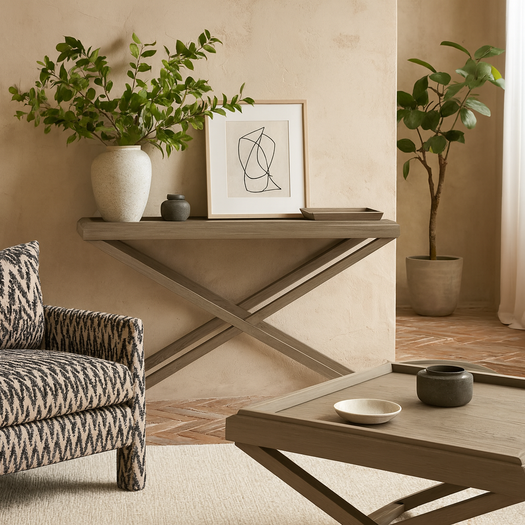 The Siena Grey Ages Oak Cross Frame Tray Console Table captures the essence of modern rustic design with a refined, effortless edge. Crafted from natural oak, its smooth surface reveals the gentle grain and character of the wood, while the striking cross frame legs bring a sense of balance and sculptural simplicity. The detachable tray detail adds a touch of function to its form — a thoughtful accent that enhances its artisan appeal.