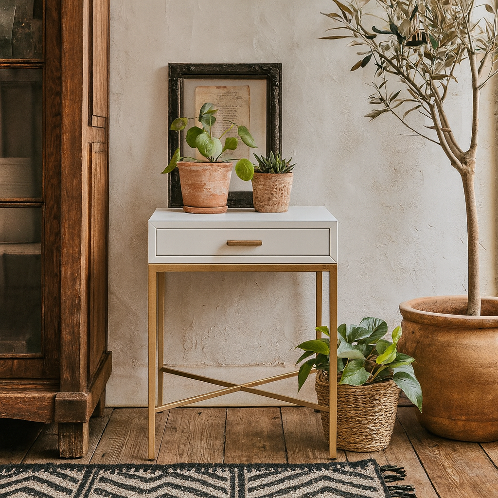 The Ravenna bedside table brings a sense of understated elegance to the bedroom. Finished in a soft white high gloss, it reflects light beautifully while maintaining a calm and refined presence. The fine tapered legs and trim are finished in brushed gold, lending a warm contrast that enhances its contemporary silhouette. The single drawer, set on smooth metal runners, keeps essentials neatly stored.