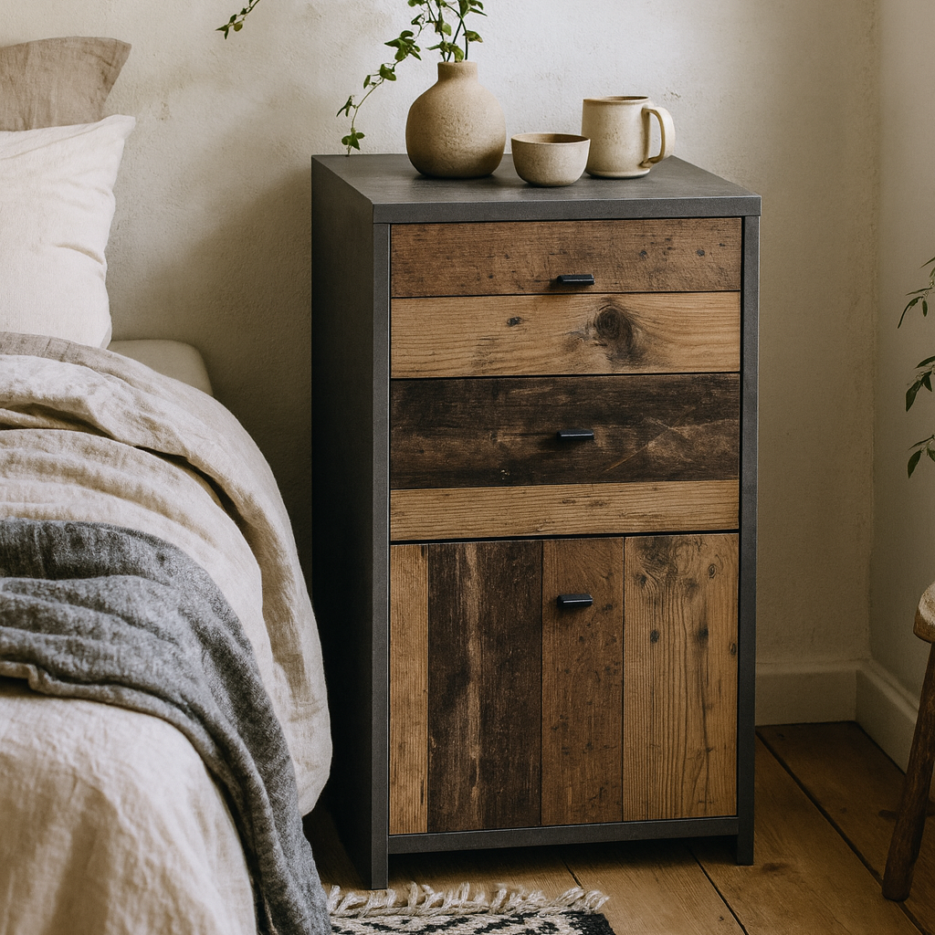 Two drawers offer easy access for everyday essentials, while the cupboard below hides larger items out of sight. The patchwork wood finish adds a lived in feel, balancing practicality with a confident design led edge that feels effortlessly cool.