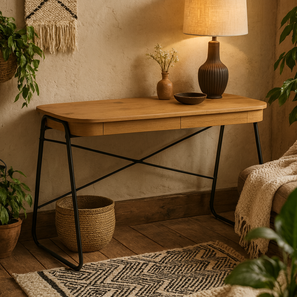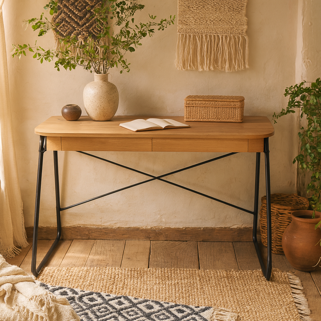 Bring a calm modern focus to your workspace with this desk that blends a matt wild oak effect surface with a black steel frame. The contrast feels clean and grounded, giving the room a confident but unfussy presence. Its minimalist shape keeps the space feeling open, making it a natural fit for home offices or creative corners where clarity matters.
