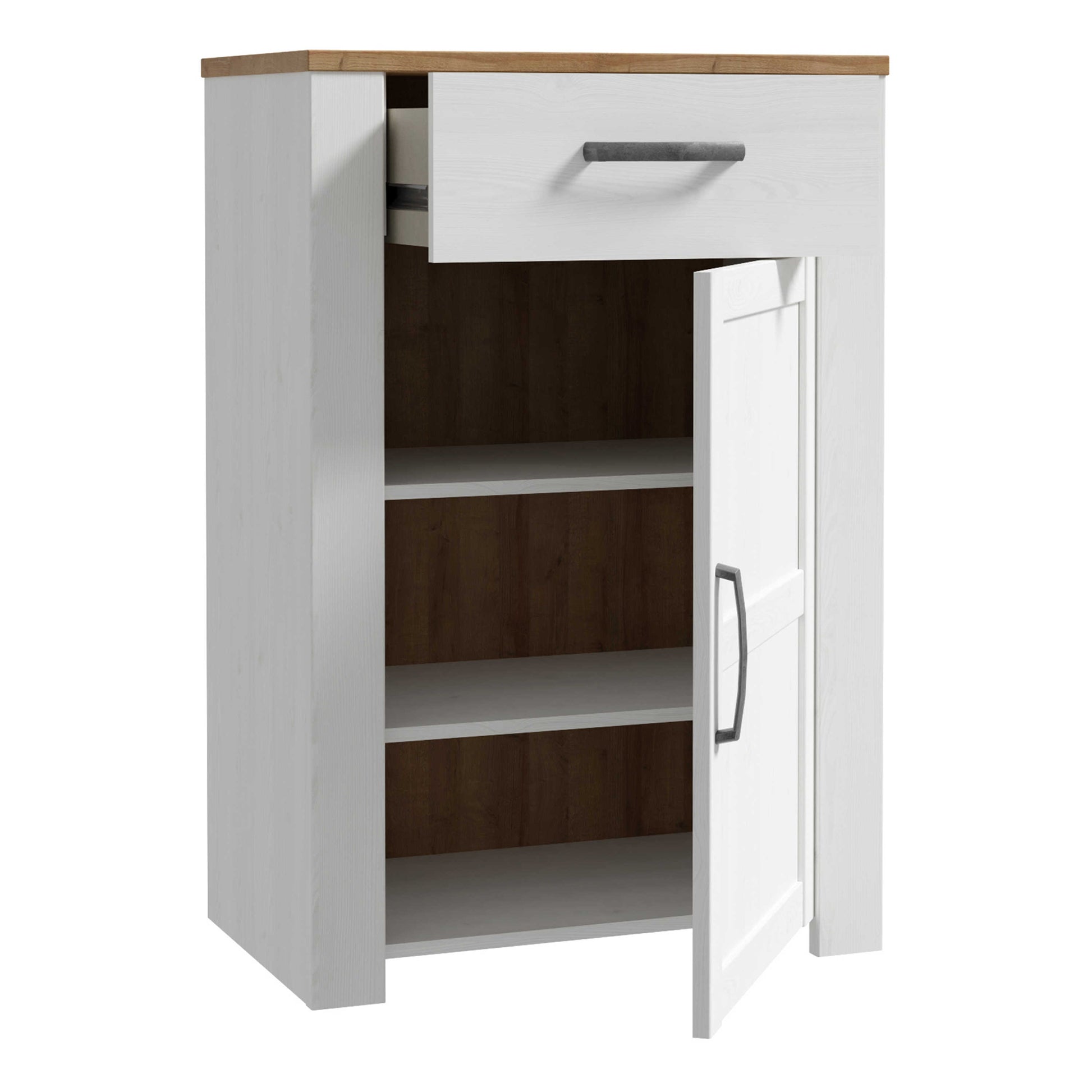 With a smooth running top drawer for keys, leads and everyday essentials, alongside a spacious cupboard fitted with multiple shelves for shoes and boots, this cabinet keeps everything neatly arranged behind a clean refined front. The sturdy oak textured top holds up to twenty kilograms, perfect for décor or a tray for post, while the reinforced ABS edging ensures lasting durability. Ideal for small homes or busy households, it offers thoughtful storage, easy daily use and a timeless two tone finish that adapts seamlessly to both modern and traditional interiors.