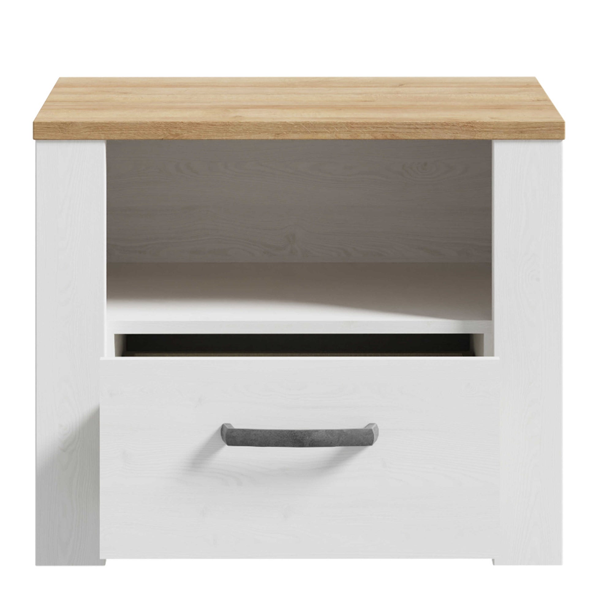 Bring an easy modern calm to your bedroom with this bedside table that blends clean white tones with the warm texture of oak. The look feels fresh yet comforting, adding a quiet sense of balance beside the bed. A smooth drawer keeps nighttime essentials neatly tucked away, while the open shelf below invites personal styling, from books to favourite objects. It settles into the space with a relaxed confidence that feels both practical and thoughtfully designed.