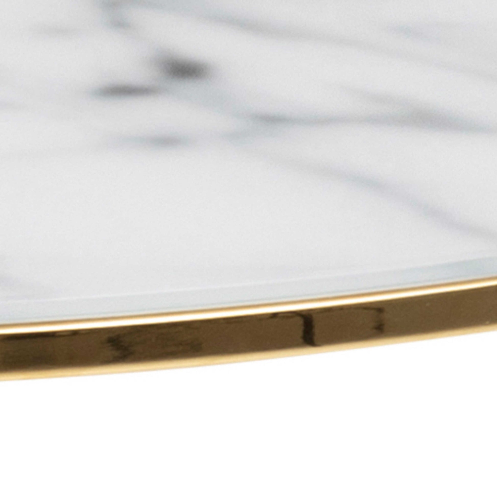 Bring a touch of quiet glamour to your living room with this round coffee table that blends a white marble effect glass top with a gold chrome base. The look feels refined yet relaxed, catching the light beautifully while keeping the space feeling open and balanced. Its rounded form softens the room and creates a natural centre for coffee cups, books and easy conversation.
