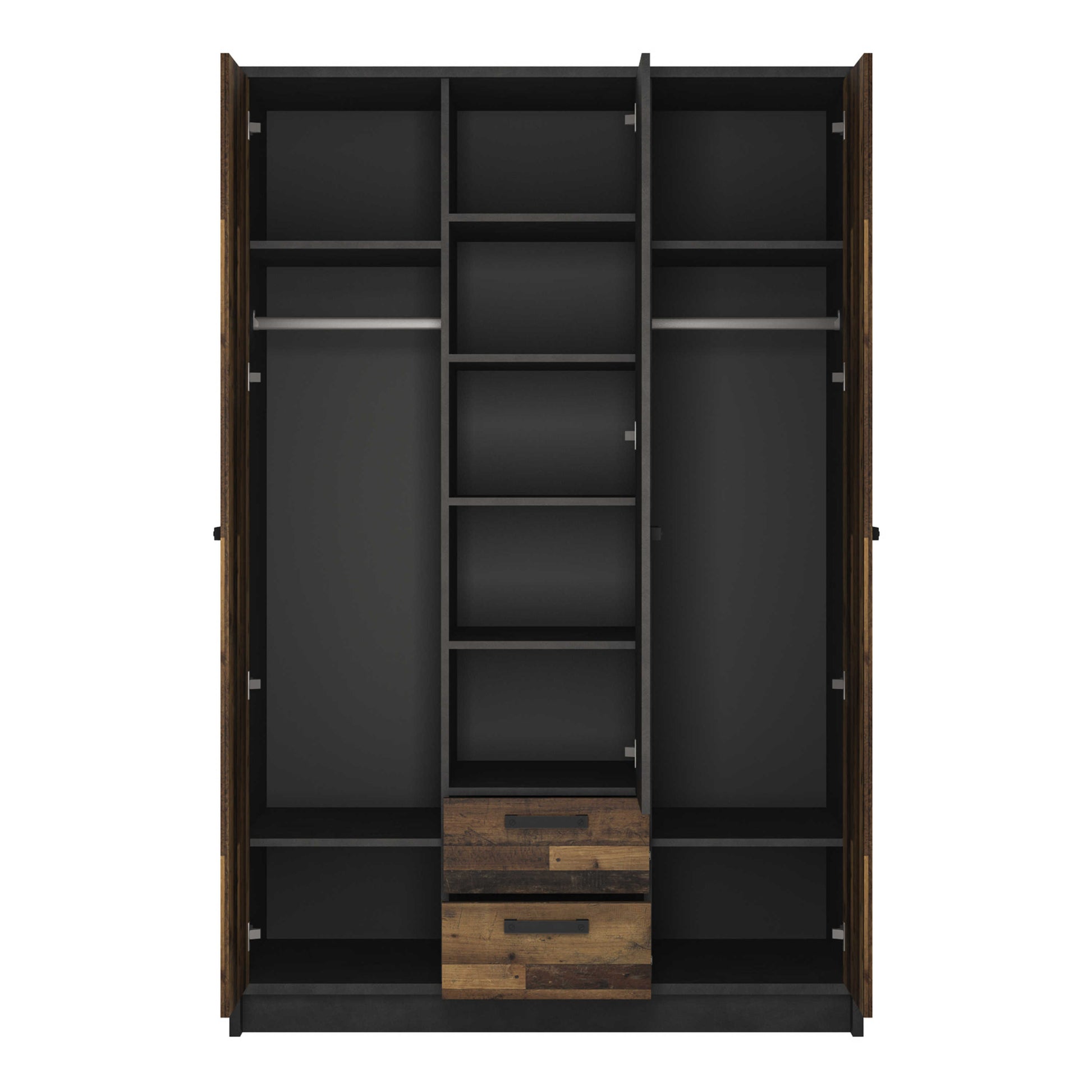 Grounded and expressive, this wardrobe brings an industrial mood through warm walnut tones balanced by deep grey accents. The contrast feels confident yet welcoming, adding character without overpowering the room. Its solid presence suits modern bedrooms that favour texture and tone, creating a space that feels organised and thoughtfully put together.