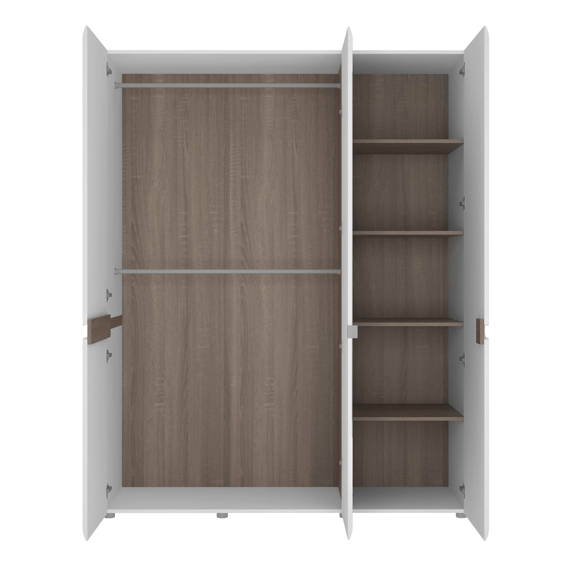 Calm sophistication defines this three door wardrobe, finished in crisp white with warm oak toned detailing that brings balance and depth to the bedroom. A full length mirror adds light and openness, making daily routines feel effortless while giving the room a brighter, more considered atmosphere.
