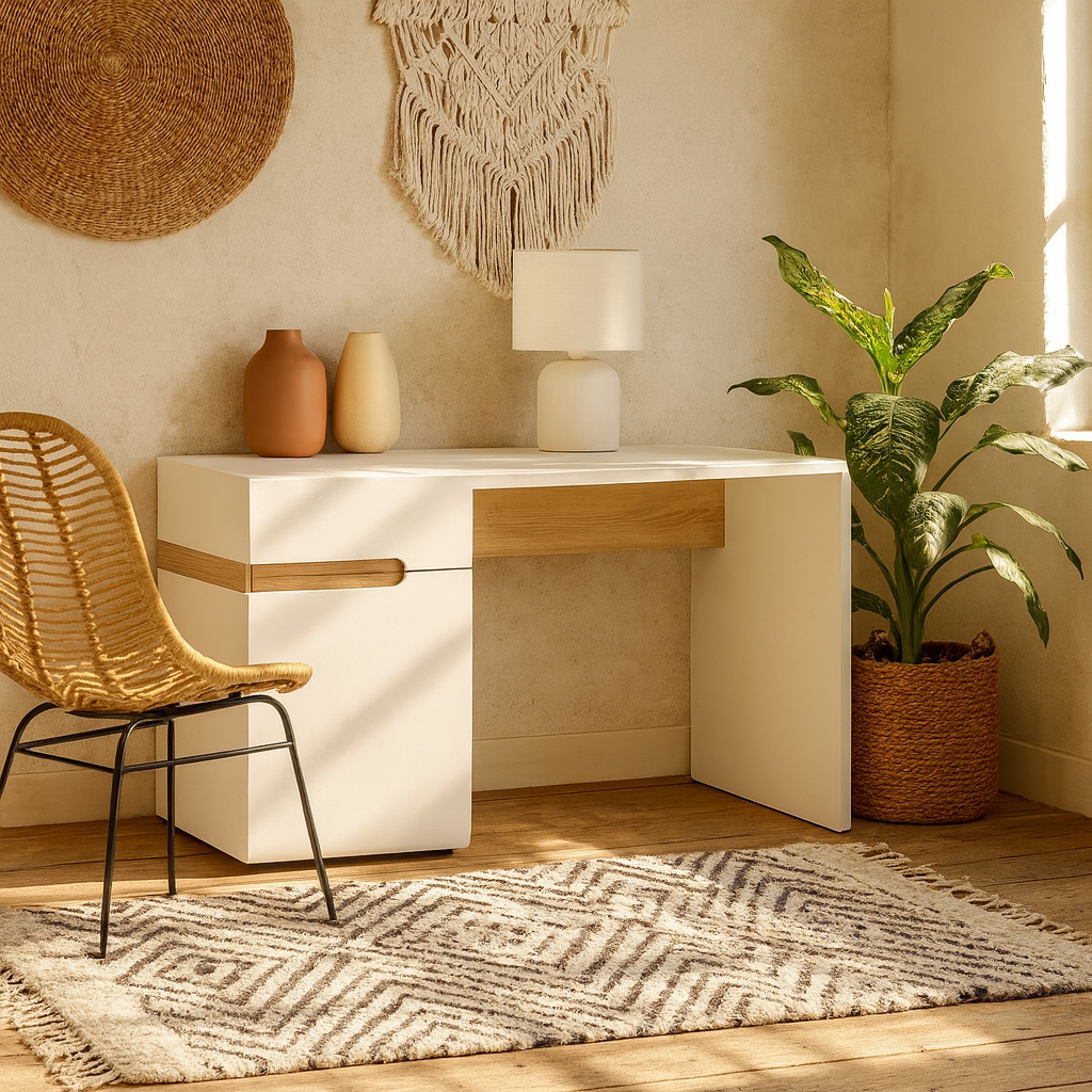 Foxwhisk Desk Table White and Truffle Oak Wood 1 Drawer 1 Door