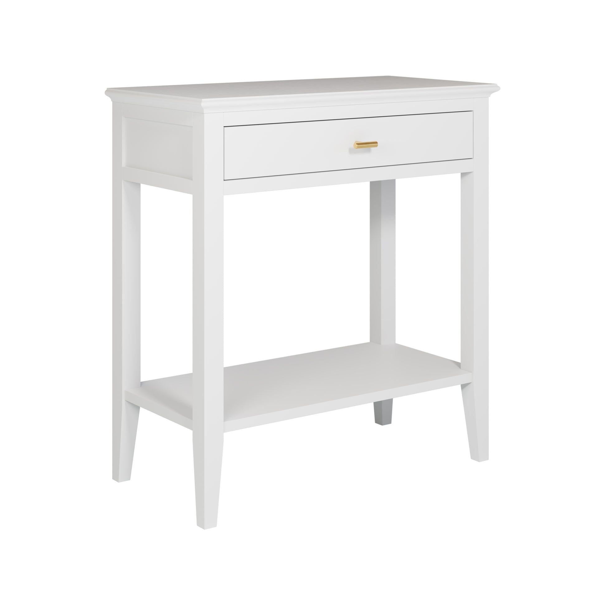 With its clean proportions and refined simplicity, this piece captures the essence of modern artisan design. The white wood grain finish adds a gentle texture that softens its structured frame, while the brushed brass handle offers a hint of warmth and polish. Its single drawer and open shelf make it as practical as it is elegant, bringing function to even the most compact of spaces.