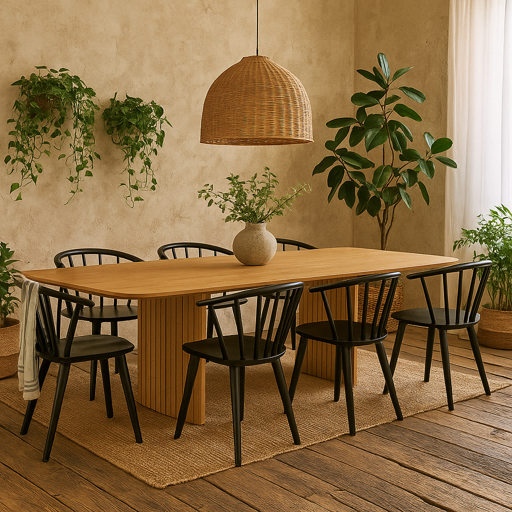 This 140 cm oak dining table paired with six black rubberwood chairs brings a warm, modern feel to both compact and spacious dining areas. The lacquered oak veneer top sits on a distinctive lamella base, giving the set a natural, refined look that settles easily into a cosy corner, open plan kitchen or family dining room. The chairs add contrast with their matte black finish, creating a balanced combination of texture, durability and everyday practicality.