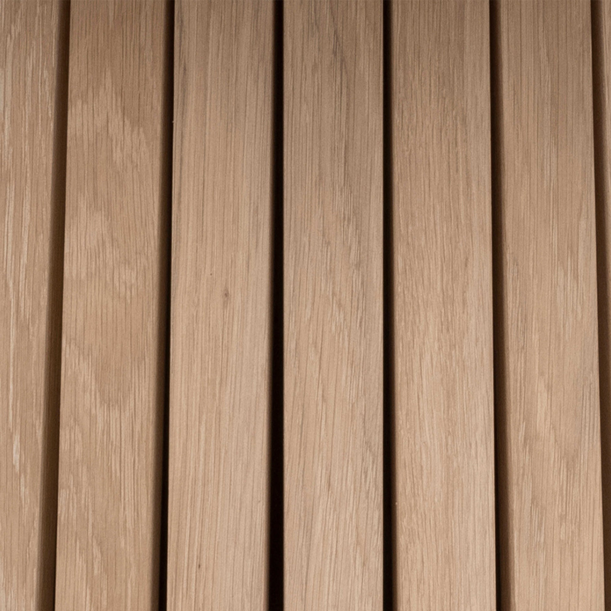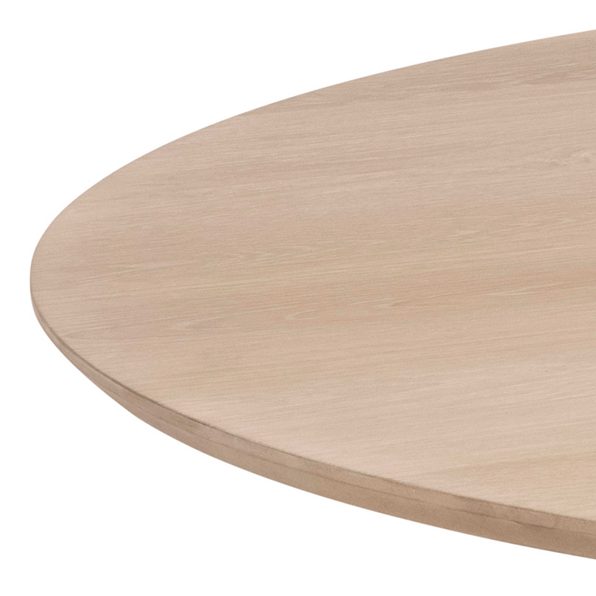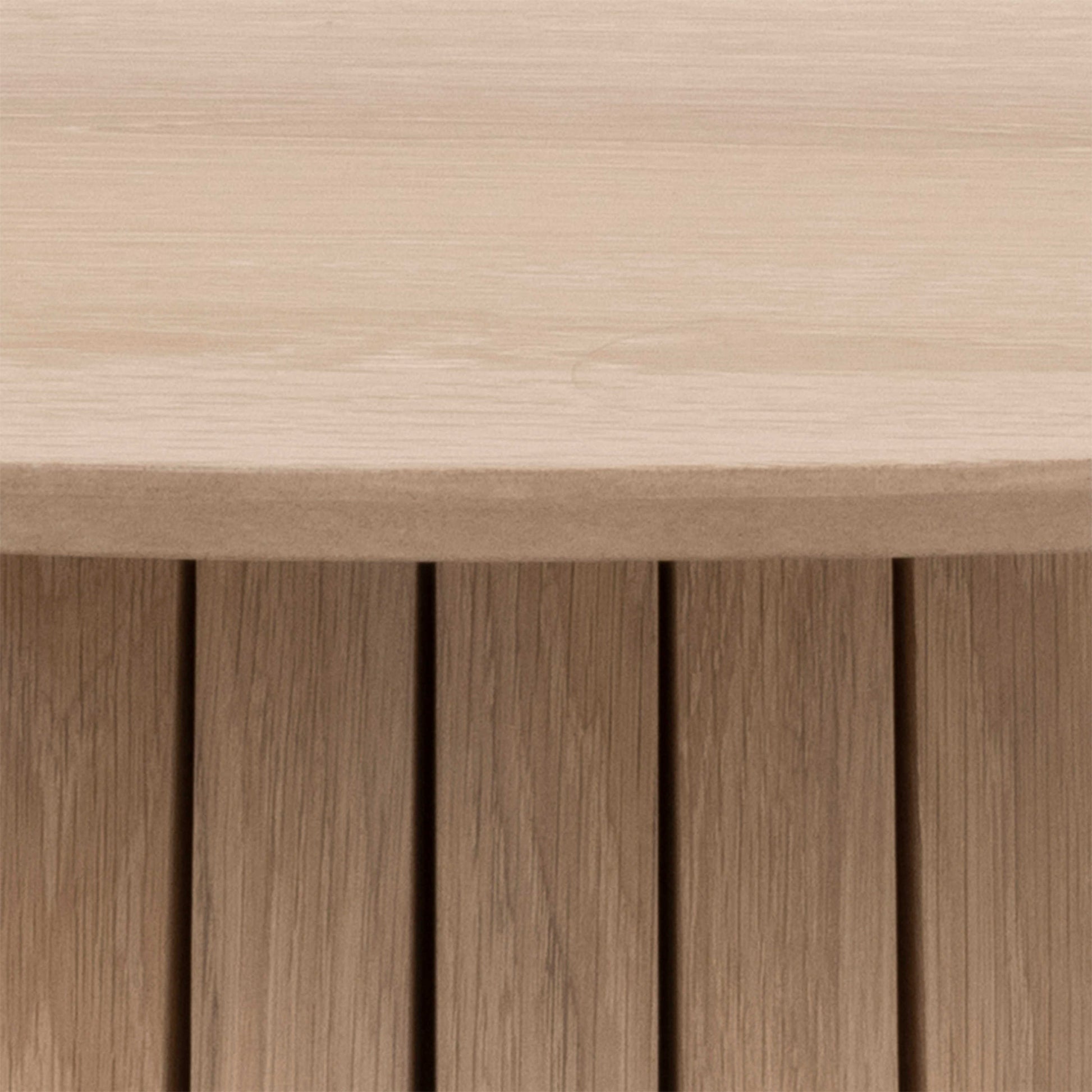 Calm and sculptural, this round dining table brings Nordic simplicity into the home with a soft white pigmented oak look. The smooth top feels light and inviting, while subtle slatted detailing around the conical base adds texture and quiet character. It creates a refined focal point without feeling formal or heavy.