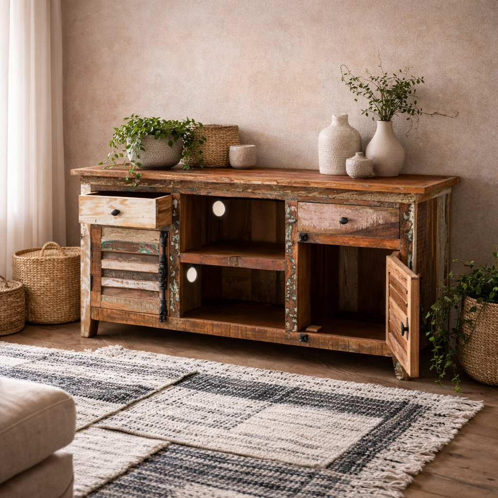 This media sideboard brings bold rustic charm and vibrant coastal energy to any living space, crafted from reclaimed wood rich in weathered textures, layered colours and unique grain patterns. Every panel carries its own history, creating a one of a kind piece full of character and warmth.