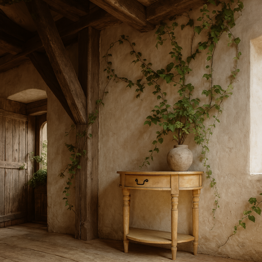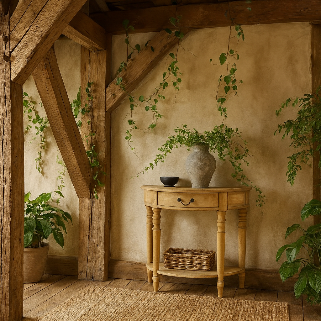 This half-moon console table brings a rustic elegance that feels timeless yet easygoing. Crafted in natural wood with a soft, washed finish, it highlights the grain and texture in a way that feels organic and lived-in. The curved design softens the look, while the turned legs add a touch of traditional craftsmanship. A single drawer with a black metal handle offers a practical spot for keys, notepads, or little essentials, and the lower shelf provides extra space for styling or storage.