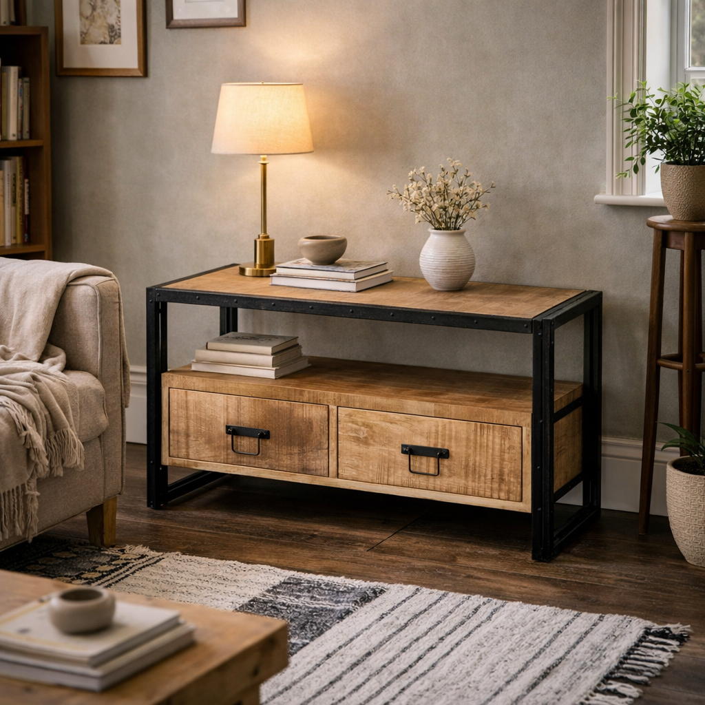 Designed for practical everyday use, this TV cabinet includes two generous drawers to keep media essentials neatly organised. Supplied fully assembled and crafted using eco friendly wood, it delivers durability, individuality, and relaxed industrial attitude in one solid, expressive piece.