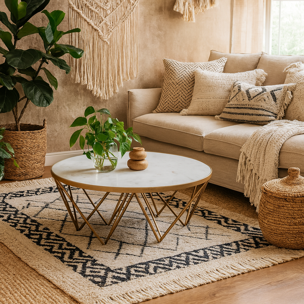 The Livorno coffee table brings a light, modern elegance to any living space. Its recycled glass top features a printed marble effect in tones of white with subtle blue and grey veining, offering the beauty of stone with a contemporary twist. The round surface is framed by a soft gold rim, resting on a geometric metal base that adds sculptural interest and stability.