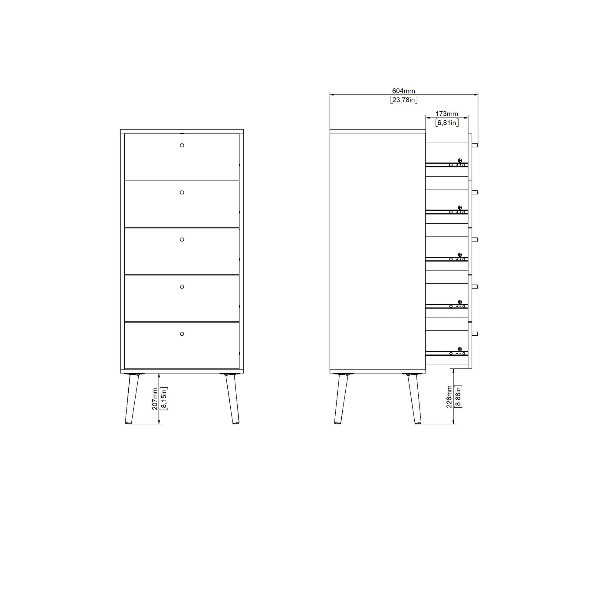 Vertical and refined, this narrow chest brings a quiet sense of order to contemporary interiors. Its minimalist profile keeps the look light, while five drawers offer generous storage without overwhelming the room. The design feels calm and intentional, making it an easy fit for bedrooms that favour clarity and balance over excess.