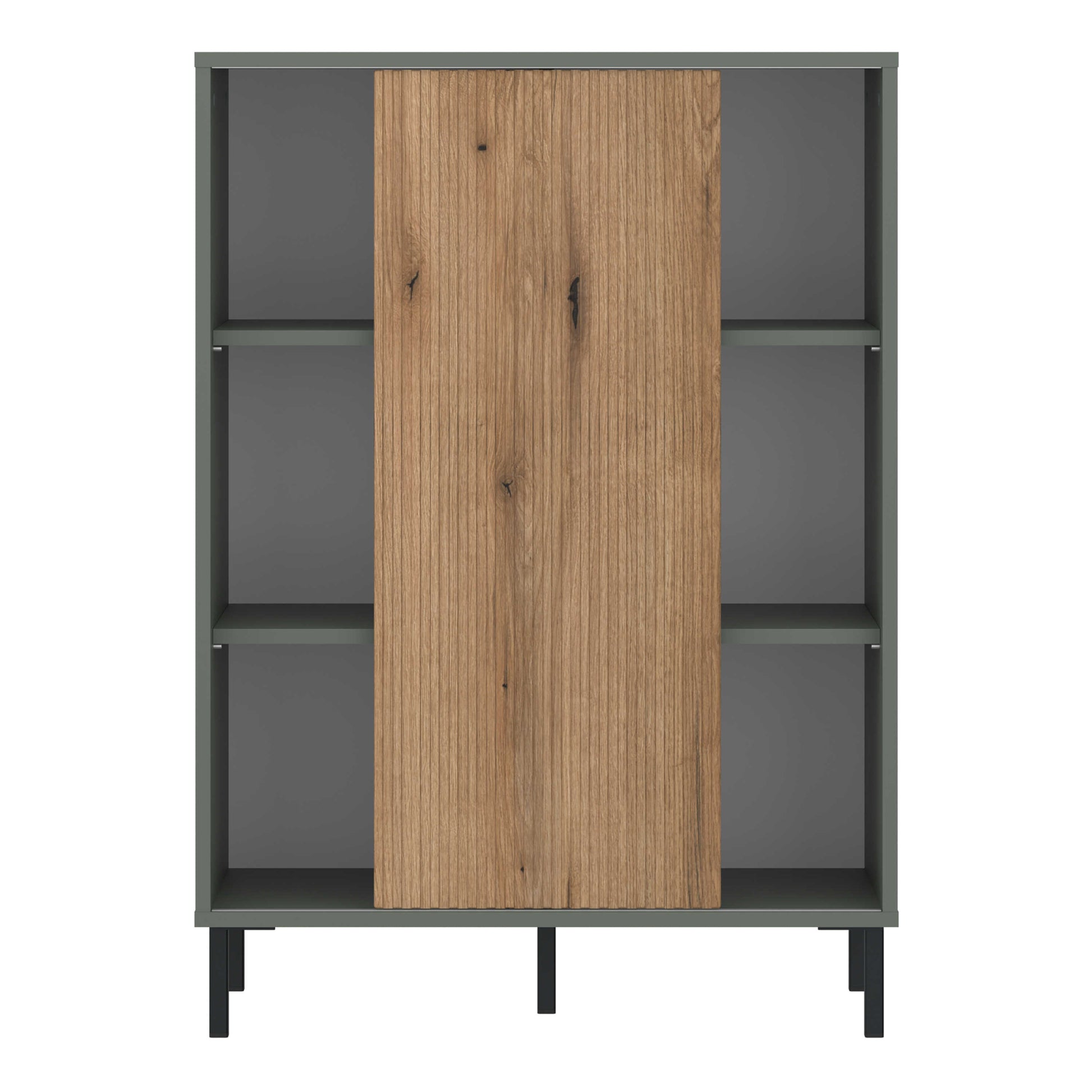 Refresh the room with a sideboard that balances calm colour and confident structure. A soft grey green body is paired with a grooved oak sliding front, adding texture and warmth without visual noise. Raised metal legs give the design a light, architectural stance that feels modern yet relaxed.