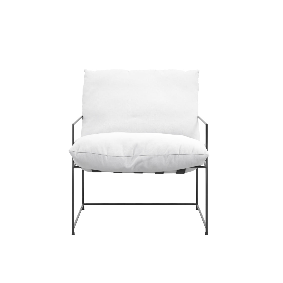 Upholstered in white house weave fabric, the seat adds texture and warmth against the darker frame. The contrast keeps the look fresh and considered, blending comfort with character. Designed for lounging, this chair brings an easy going attitude to the space, offering a laid back spot that feels stylish, practical, and effortlessly modern.