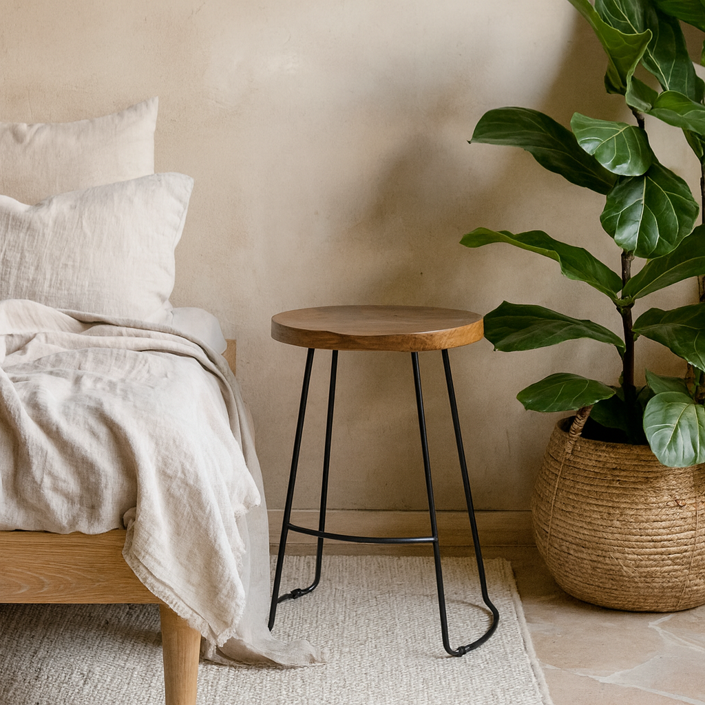 Raw and refined, this mango wood stool captures the beauty of natural materials with a modern industrial twist. The hand-finished seat showcases unique grain patterns and organic edges, while the slim black metal legs bring a lightweight yet grounded silhouette.