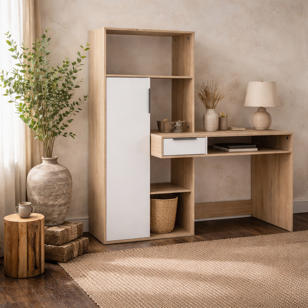 Designed for modern working, this desk brings together clean form and everyday flexibility in a calm, organised layout. A white and oak look keeps the mood light and balanced, making it easy to place in compact rooms or open plan spaces without visual noise.