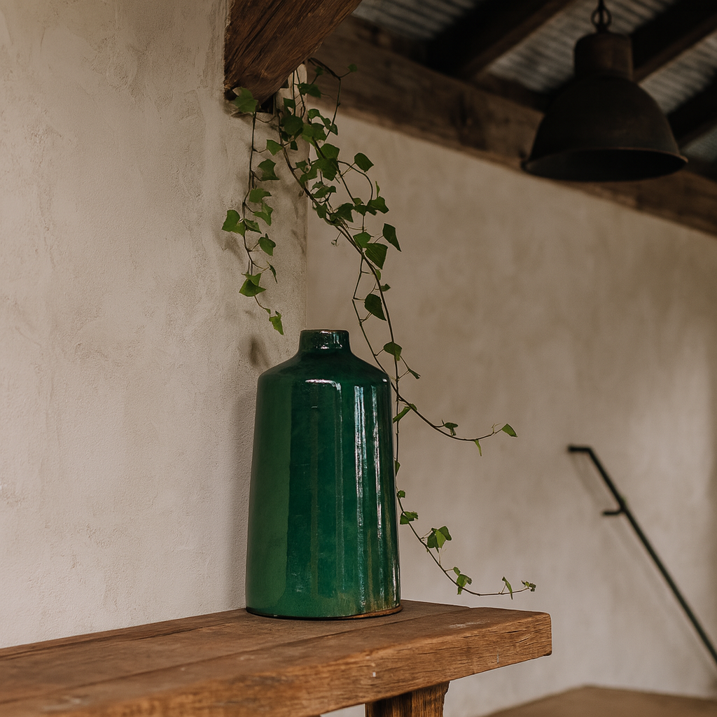 A masterfully glazed emerald ceramic vase, its surface marked by subtle distressing that gives each piece a character all its own. The deep green finish shifts with the light, adding depth and richness that feels both bold and timeless.