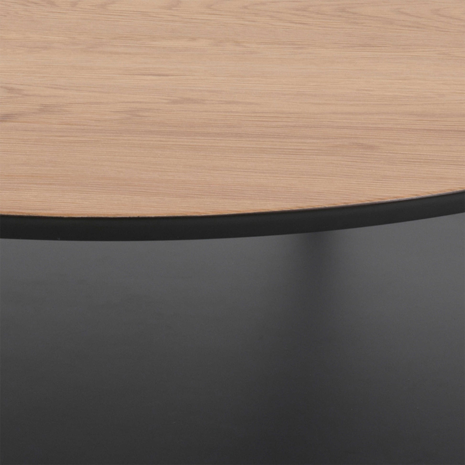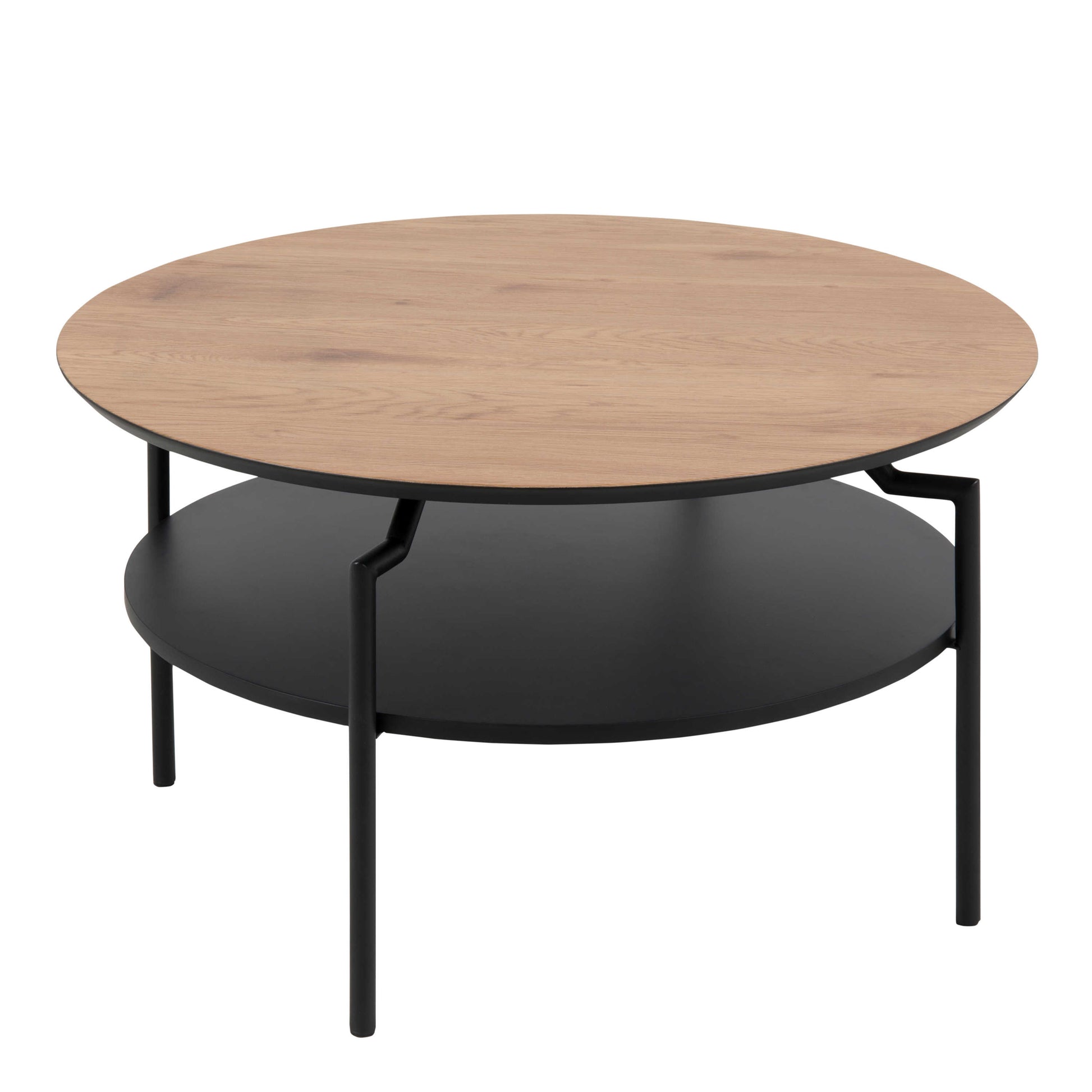 Warm up the room with a round coffee table that blends natural character with modern contrast. A matt wild oak effect surface brings softness and depth, while a black steel base and lower shelf add graphic balance. The layered build creates a calm focal point that feels considered and easy to live with.