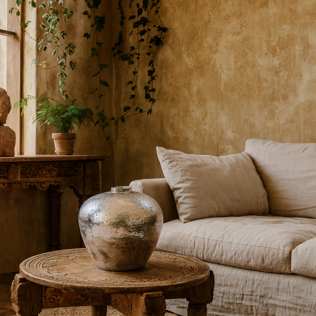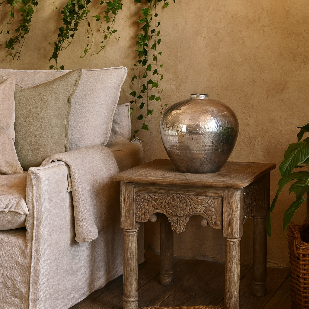 This hammered silver vase brings that perfectly imperfect artisan energy into your space. Its rounded silhouette, finished with a hand-forged texture, catches the light in a way that feels both raw and refined. The metallic surface isn’t overly polished — it celebrates every dimple and variation, giving it a lived-in, soulful character. It’s the kind of piece that feels just as at home in a pared-back loft as it does layered into a rustic boho corner.