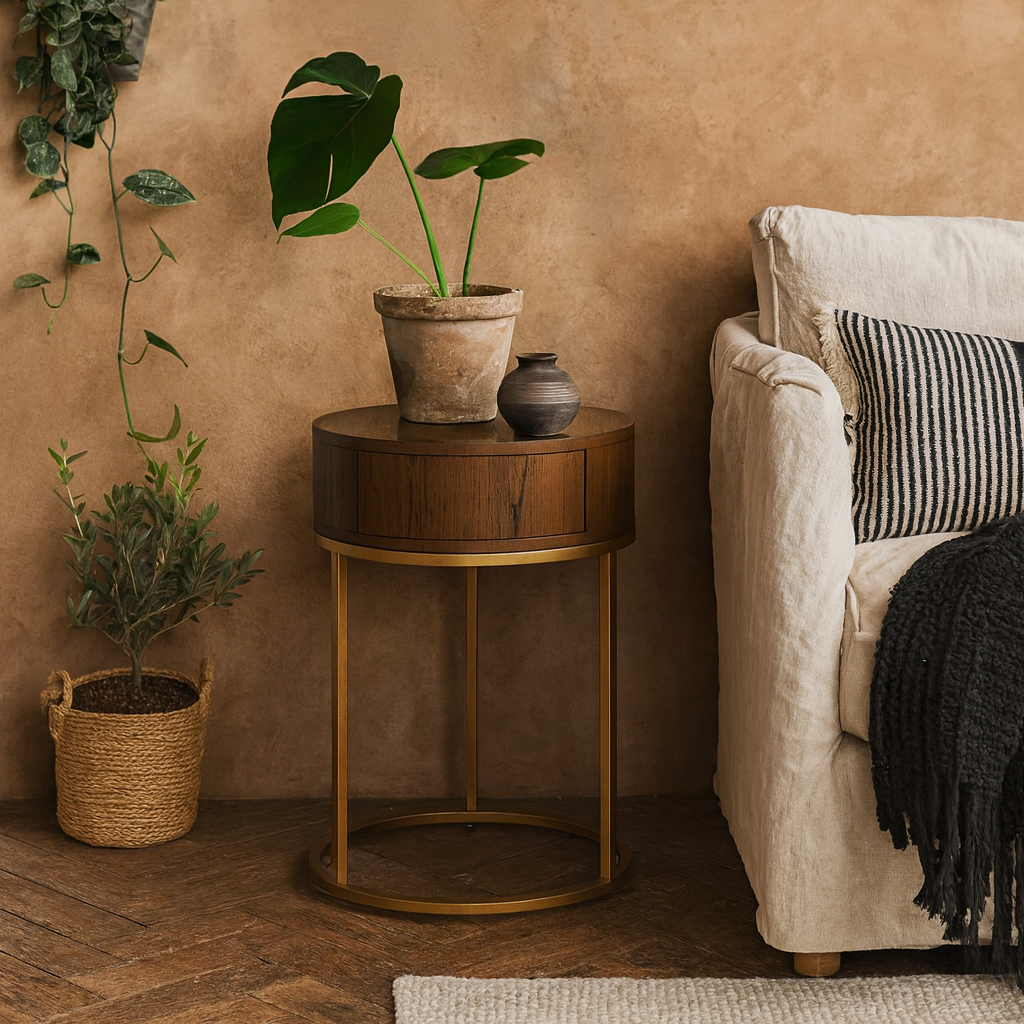 The Padua bedside table showcases timeless craftsmanship with a modern edge. Made from oak veneer in a rich walnut tone, it features a round silhouette set on slender brass-style metal legs. The single drawer operates with a smooth push-close mechanism, maintaining a clean, uninterrupted design.