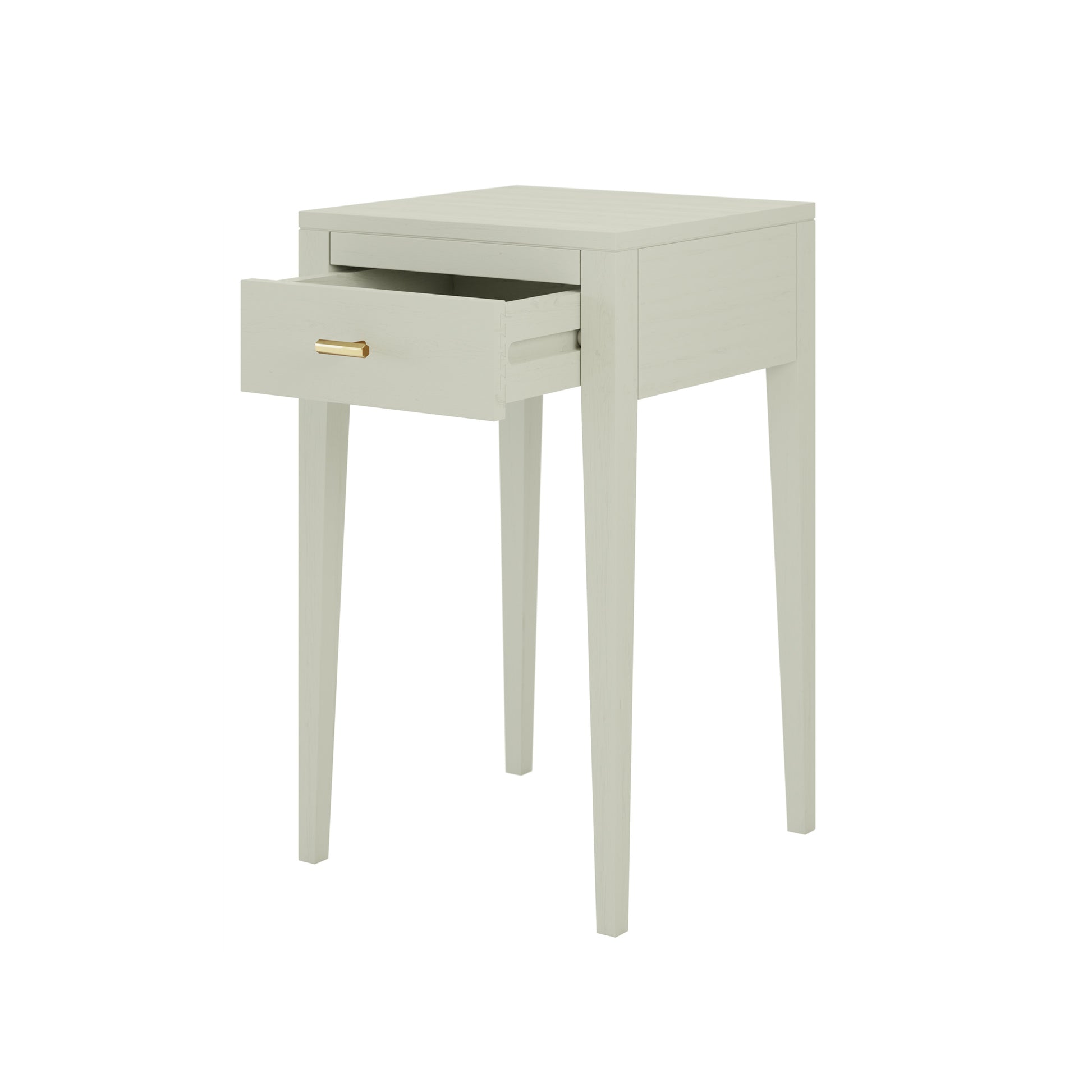 A quietly refined piece that blends modern form with artisan warmth. The mist grey finish highlights the gentle wood grain beneath, creating a soothing, tactile look that feels both contemporary and timeless. Slender legs and a single brass handle bring balance — a soft nod to understated design with a touch of golden charm.
