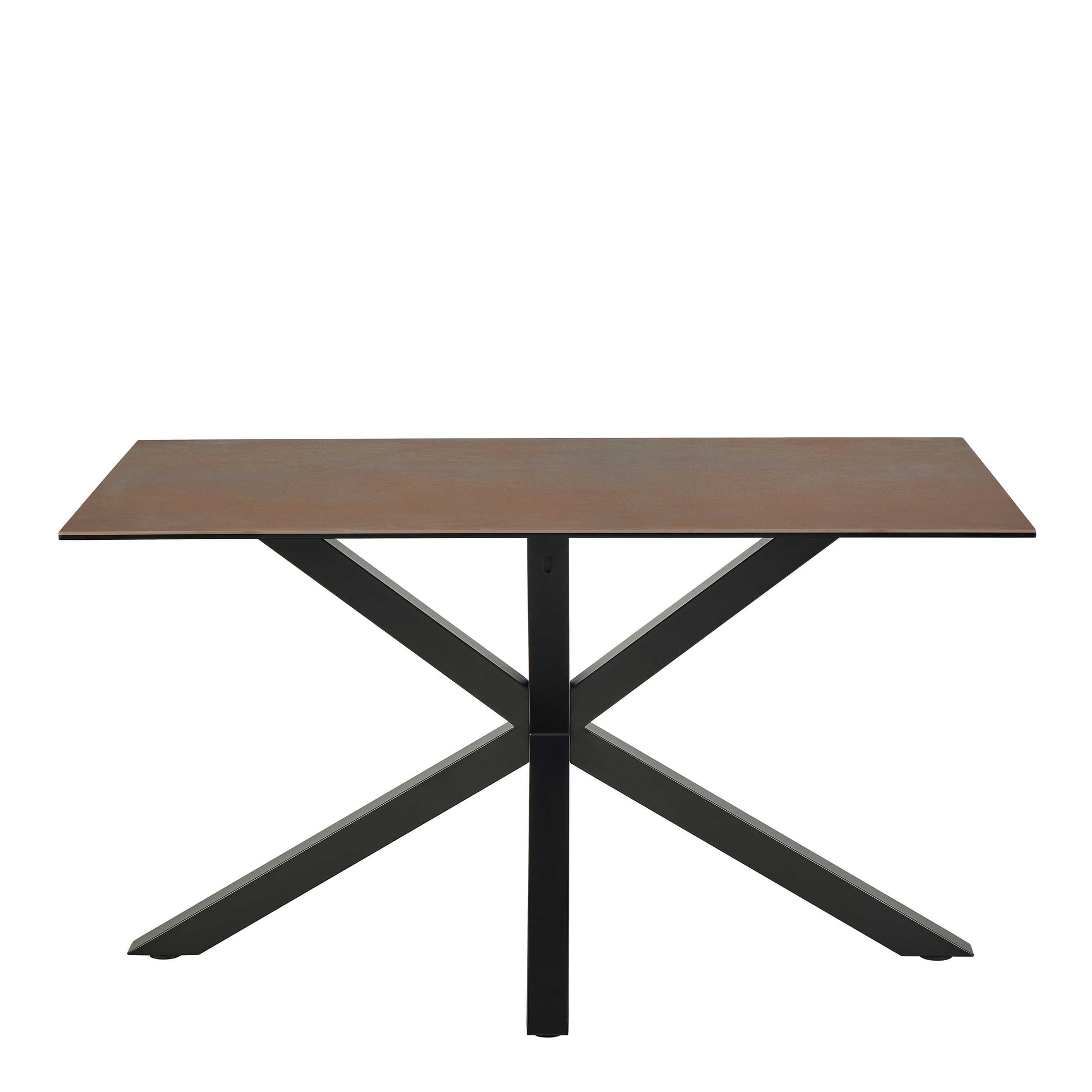 This dining set brings a warm modern mood with its mottled rusty ceramic top, adding a relaxed hipster charm to calm family spaces or bright contemporary homes. The durable surface resists heat and scratches, keeping the table fresh through creative afternoons or cosy evening meals. Supported by a sculptural black cross base, it offers a grounded and expressive presence while seating four comfortably. Its balanced proportions blend easily with natural textures, soft lighting, or minimalist decor.