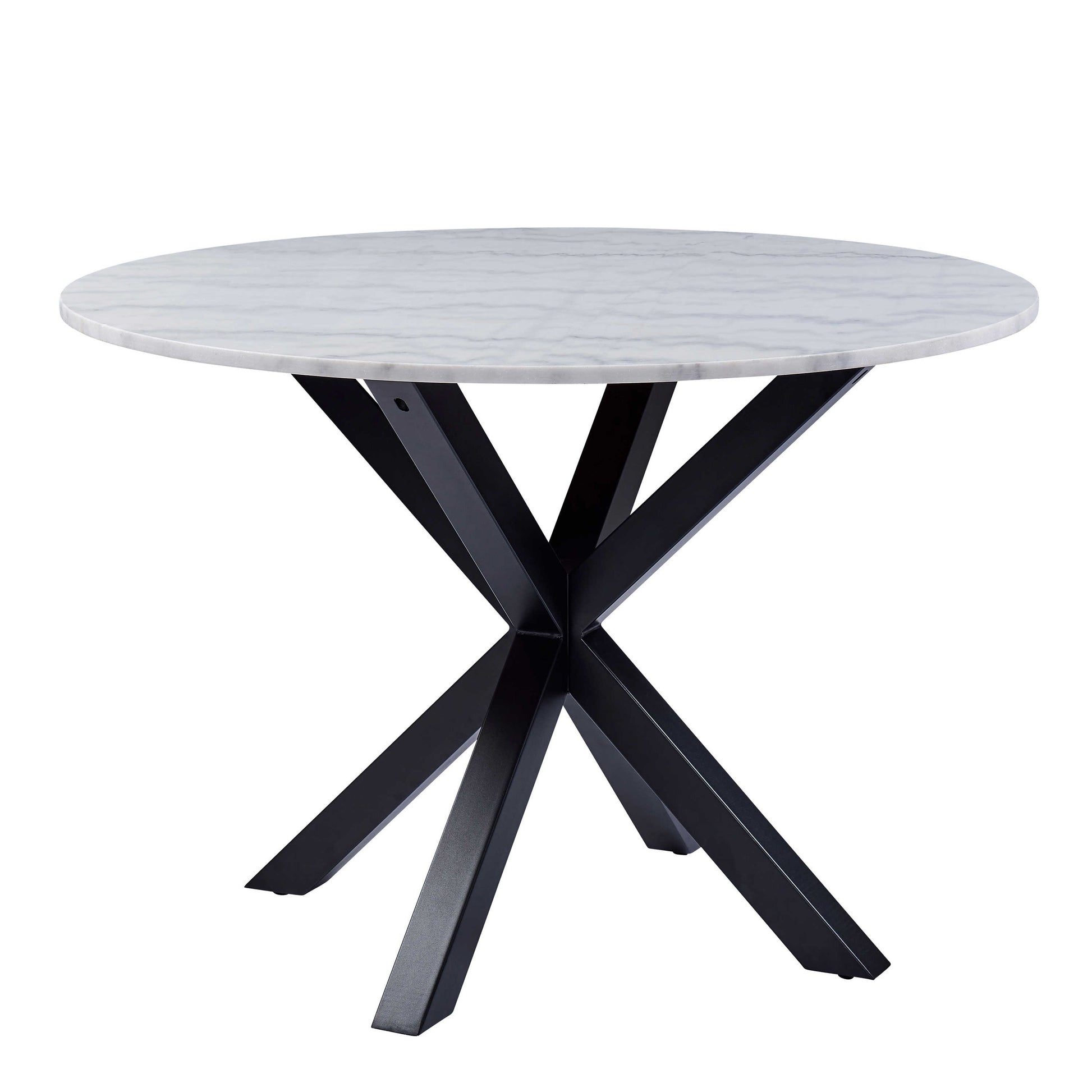 This dining set brings a refined modern mood with its polished white marble top, adding a relaxed hipster charm to compact dining spaces. The natural veining gives each table a distinct character, creating a centrepiece that feels both expressive and timeless. Its balanced round form keeps the room open and inviting, while the matte black cross base offers sturdy support and a contemporary edge that settles easily into Scandinavian inspired or modern interiors.