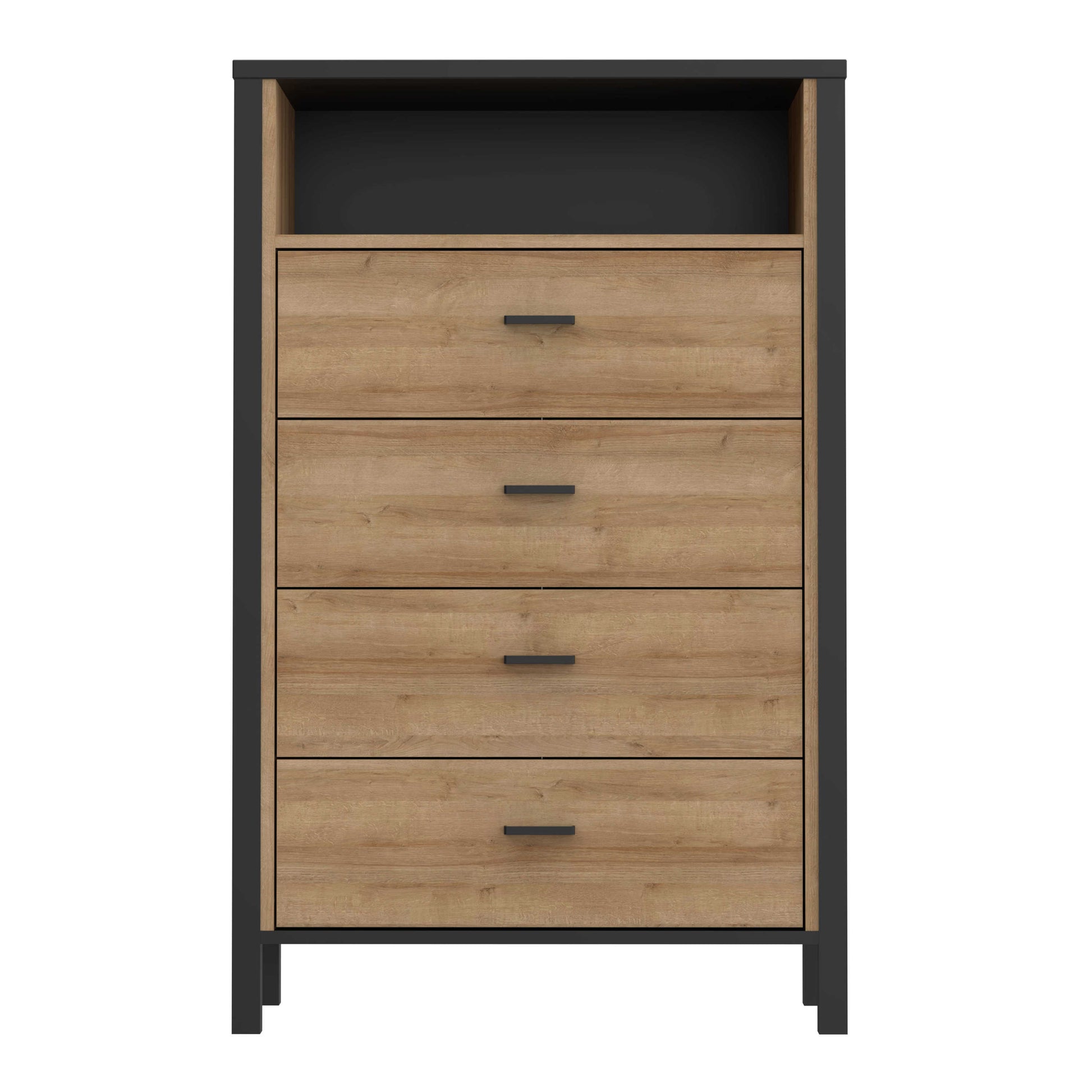 Driven by bold contrast, this storage piece blends Riviera oak tones with deep black accents for a confident loft inspired look. Four drawers are paired with an open top shelf, creating a balanced layout that feels both structured and relaxed. Black metal handles sharpen the design, adding an industrial edge without overpowering the form.