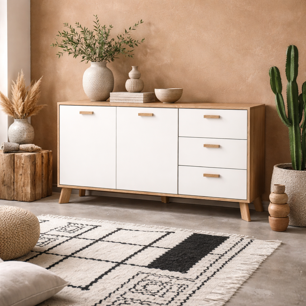 This sideboard pairs warm hickory tones with crisp white surfaces to create a confident modern look. Clean lines and balanced contrast give it presence without overpowering the room, making it an easy addition to contemporary interiors that value calm design and visual clarity.
