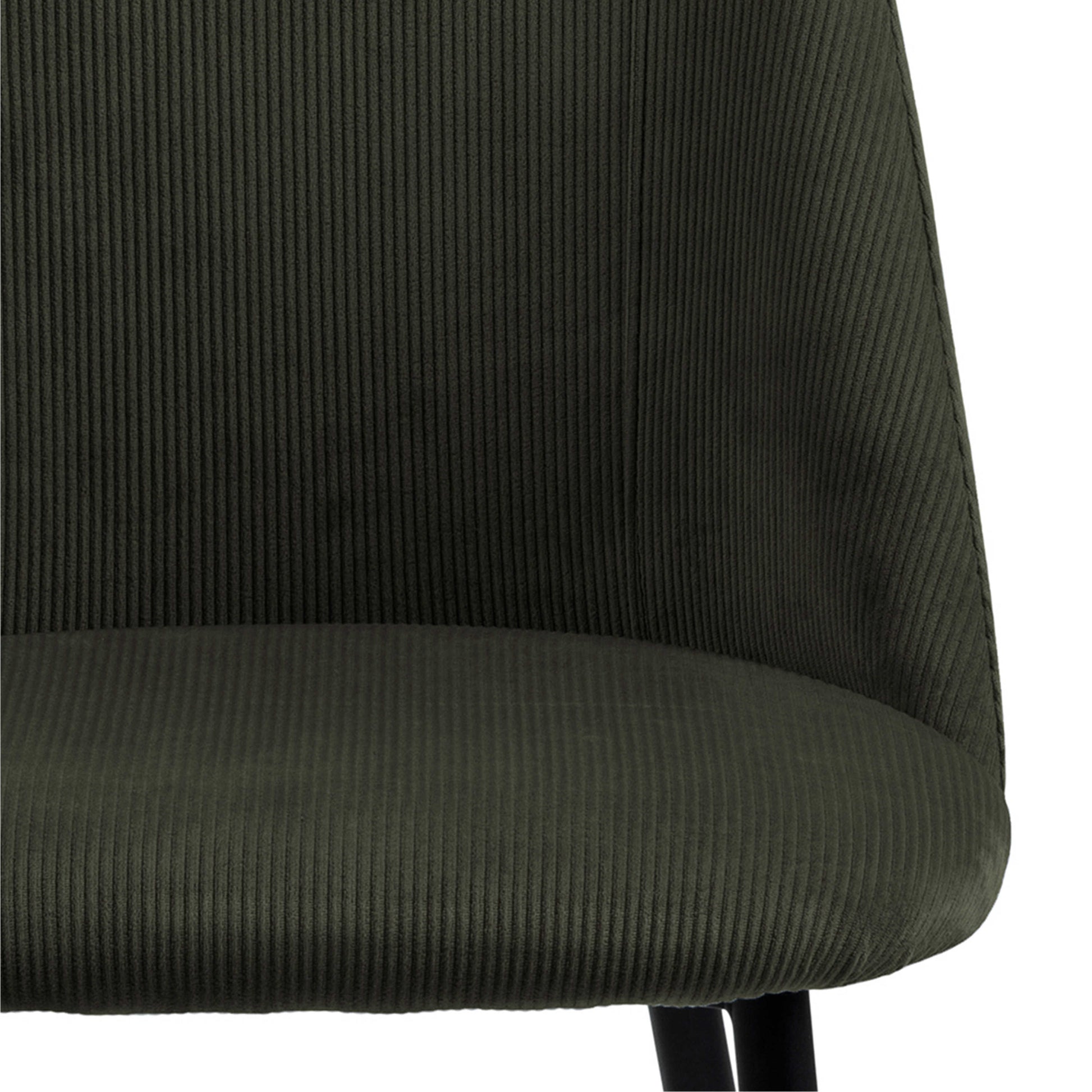 This set of 4 dining chairs brings a rich, grounded feel with olive green corduroy upholstery that adds warmth and texture to the room. The sculpted backrest creates a relaxed, supportive sit, giving each chair a confident presence that feels inviting rather than formal. The look balances softness with structure, making it easy to pair with both rustic wood tables and more modern settings.