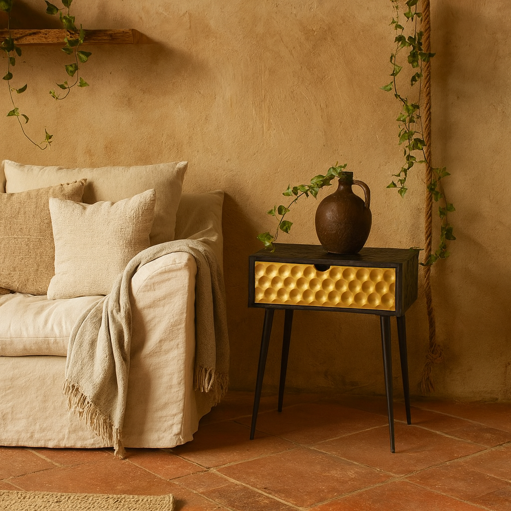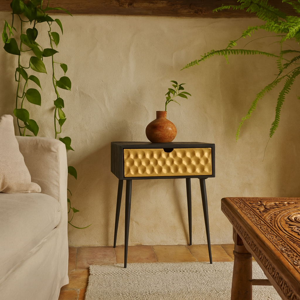 The Ingolstadt bedside cabinet is an instant statement in modern metal design. Entirely made from steel, it features a black painted body, a gold-effect drawer front with pressed honeycomb detailing, and mid-century tapered legs. Easy-glide runners ensure smooth functionality.