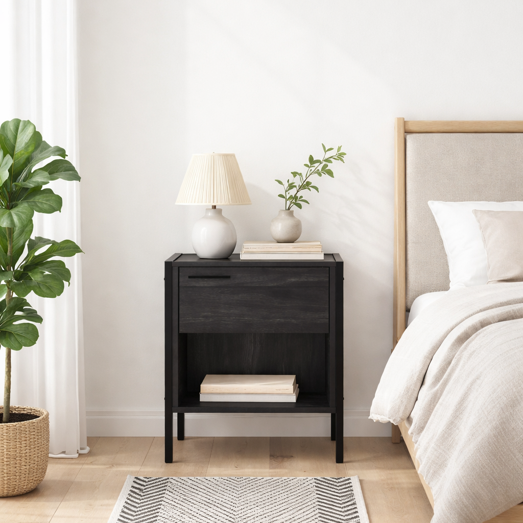 Urban attitude defines this bedside cabinet, pairing a matt black metal frame with a deep black wood effect finish. The look feels confident and grounded, bringing industrial character without overpowering the room. Clean lines and balanced proportions keep the design calm, letting texture and tone create interest in a subtle, modern way.